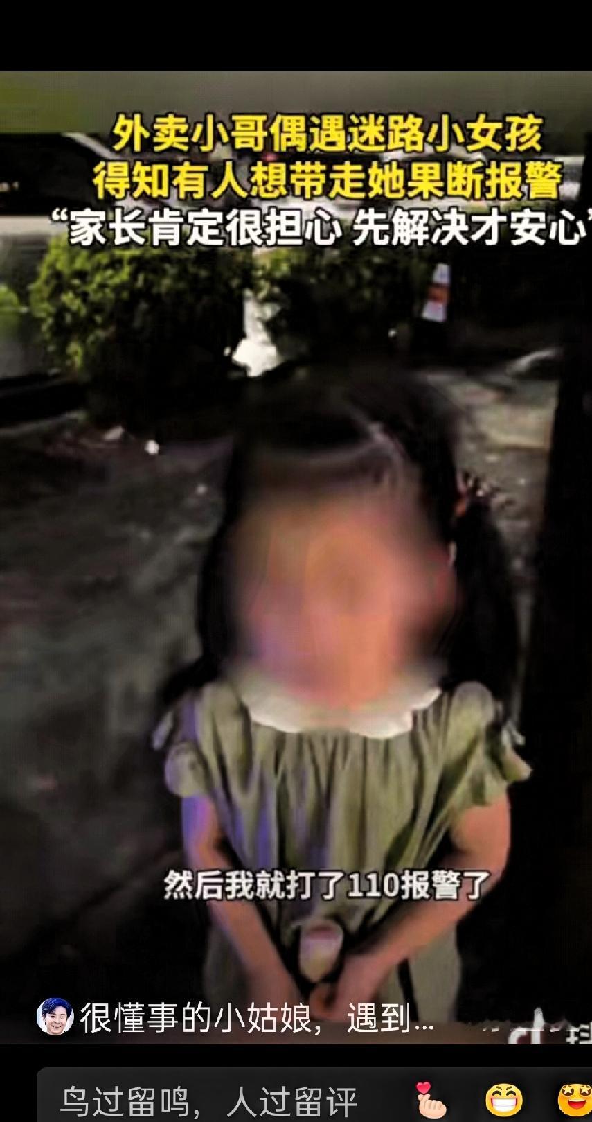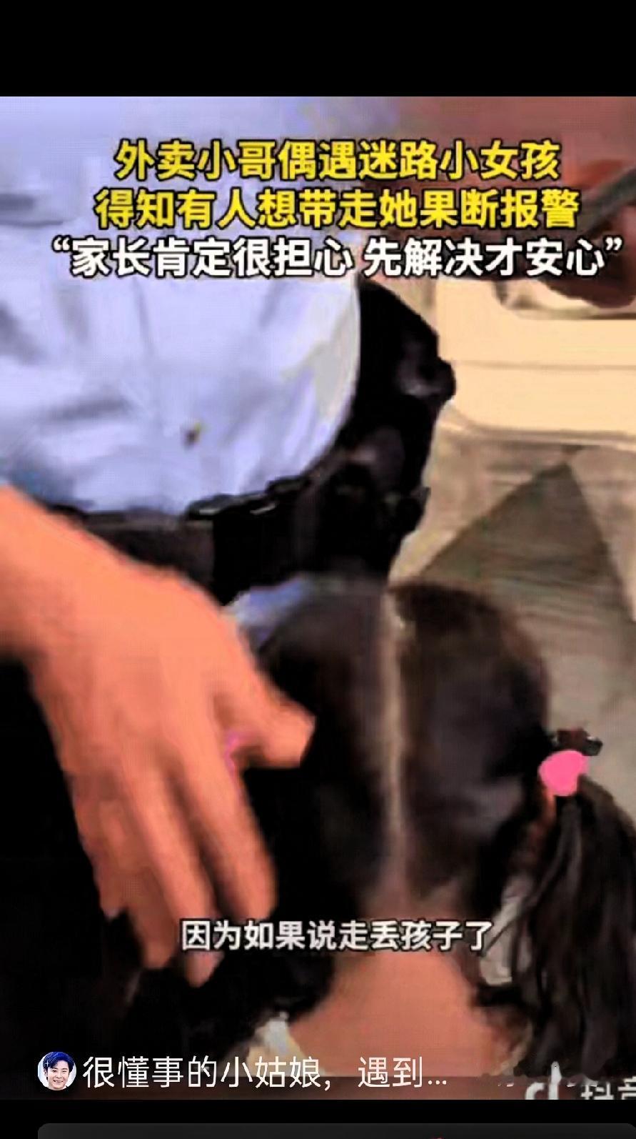 这个小女孩太聪明了!” 近日,广东,外卖员高先生刚取完餐,衣角就被轻轻拽住,低头一看,是个扎着双辫的小丫头,奶声奶气说自己迷路了,还特意补了句“有人要带我回家,我没同意”。 换旁人或许先急着送快超时的外卖,高先生却半点没含糊——订单晚了大不了跟顾客好好解释,可孩子要是出点岔子,一个家都得揪着心。 一听说有陌生人搭话,他立马拨通报警电话,蹲在路边陪娃聊天转移紧张,直到把人安安全全交给警察,才匆匆骑上车赶往下一个送餐点,餐箱里的饭或许凉了点,可人心却热得发烫。 大家都夸娃聪明,其实这聪明才是真“保命”!比起天天跟娃念叨“别跟陌生人走”,不如教娃“找对陌生人帮”。外卖员穿统一工装,天天在小区、街头转,对孩子来说是“眼熟的熟面孔”,这份主动筛选求助对象的意识,比硬扛着害怕、乱找人帮忙靠谱十倍。 咱总说外卖员是城市里的“移动熟人”,送的是热乎饭,也常顺手搭把手解急难。他们偶尔超时被催单时,没人知道背后可能刚帮老人拎过菜、帮丢东西的人找过物品,就像高先生,耽误了自己的单,却护住了别人的心头宝。 平时你会特意教娃识别“安全求助者”吗