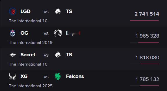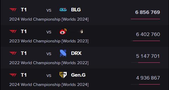 昨天英雄联盟入围赛IG vs T1的bo5在国外吸引了约250万人+的观看(不包含中国直播平台),此数据超越了今年TI总决赛XG vs Falcons的170万观众峰值,而往年S赛总决赛的观众峰值人数通常在500万左右,最近这两年的中韩大战有持续走高的趋势,配图为两项赛事历史最高峰值人数的几次决赛