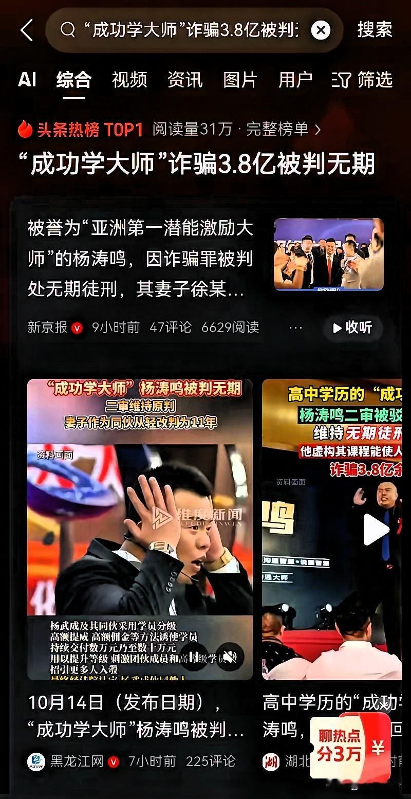 成功了吗? 成功了,刚进去,无期! 7年,3.8个亿,是精心编织还是贪婪与社会焦虑? 不妨深思一下。 杨涛鸣不是什么大人物,就是个农村出来的,高中毕业的普通人,他懂怎么把自己吹成亚洲第一潜能大师,开课从六百八十块的小课开始,一点一点让你多掏钱,有人最后花了六十万买他的私教课,他骗了两万多人,一共卷走三个多亿,二零二五年十月,法院判他无期徒刑。 他上课的地方很奇怪,门全关着,音乐一直响,课还安排在凌晨,人睡不够,脑子就转不动,他搞吞火、踩火炭,说能激活什么宇宙能量,其实啥也没有,就是让人看花了眼,晕头转向,他还叫学员拉人,拉一个给四成到五成提成,拉不到人,自己钱就回不来,只能接着拉,越拉越深。 为什么那么多人上当呢,很多是小老板,生意不好做,心里急着找条出路,还有刚毕业的年轻人,怕跟不上社会,三四线城市的人,想换个活法,手里又没多少资源,他们不是笨,是太想翻盘了,短视频里天天演草根逆袭,他们就觉得这课就是真事儿,价格越贵,越觉得值。 杨涛鸣从2018年干起这行,一个月最多收过五千多万,他拿剪辑过的央视采访、企业家出来站台、网红晒单来装门面,2023年学员们集体报案,钱拿不回来,他才垮了,这七年他专挑经济不好、人心里慌的时候下手。 现在还有人做这类事,卖冥想App,推AI成功教练,名字换一换,里头还是老办法,他们不卖东西,卖的是你心里那点盼头,你掏钱买的是“马上就能变好”的错觉,可日子不会因为你买了课就轻松下来。 真正的出路不在课里,而在你能不能看透这些套路,别把翻身的希望,交给只想赚你钱的人。