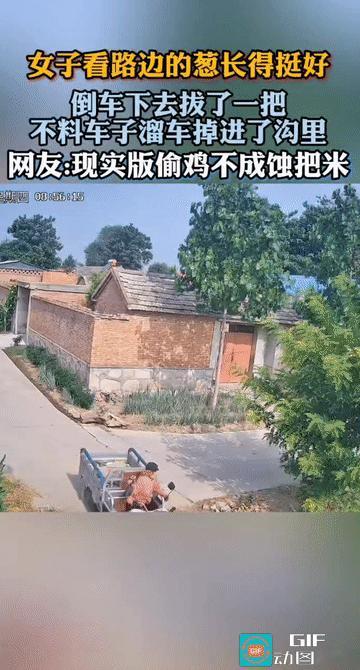 “偷鸡不成蚀把米!”一位女子开着三轮车路过某地,发现路边的葱长势喜人,便停下车顺手拔了一把。谁知就在她离开车辆的片刻功夫,三轮车突然溜坡,直接冲进了路边的沟渠中! 来源:【生活有点料】 从视频中看到,这应该是一乡村道路,只见一女子骑三轮车经过此处时,无意间瞥到了一户农家门前种的一小片葱长得非常好,便心生欢喜! 原本已经走过的她,竟专门倒车回来,想占便宜! 只见她倒车停下后,便立即下车,来到那片葱田,然后毫不犹豫的弯腰动手拔葱了,那样子好像那就是她自己家的东西一样,丝毫没有一点愧疚! 本以为此刻周围没人,女子会进行的一帆风顺,谁知就连老天都看不下去了! 就在女子下车十几秒后,那停在原地的三轮车因为那地方有些坡度,女子又没有将车停稳当,那三轮车就直接溜车了! 等女子拔了一把葱转头过来时,赶紧跑过去拉车时,已经晚了,三轮车直接掉进了路边的沟里了! “勿以恶小而为之”,古人留下的训诫至今依然适用! 那些看似微不足道的小恶,可能成为破坏社会秩序的缺口。占小便宜的心理,恰恰是许多大错的起点! 从个人层面看,每一次对小便宜的追逐,都是对品格的一次腐蚀。而从社会视角看,当这种“占便宜”心态蔓延,将增加社会运行成本,破坏人与人之间的信任! 路边的葱不论是被私人种植还是公共绿化,都不应随意采摘! 假如每个人都能守住道德底线,也许就能避免许多不必要的麻烦和悲剧! 世间之事,有时看似偶然,实则蕴藏着必然的因果。守规矩不是怯懦,而是一种远见;贪小便宜不是聪明,而是一种糊涂!