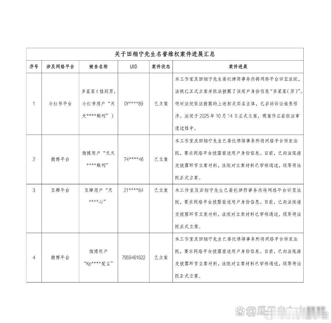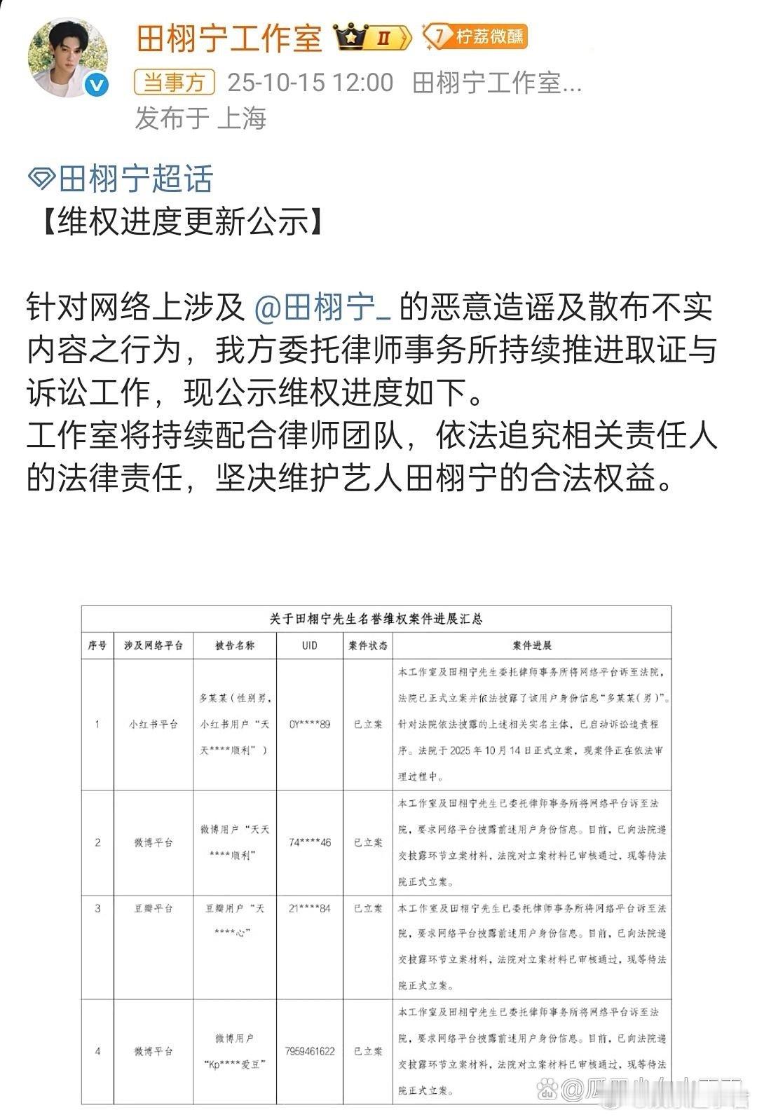 田栩宁工作室更新维权进度田栩宁工作室更新维权进度,称工作室将持续配合律师团队,依