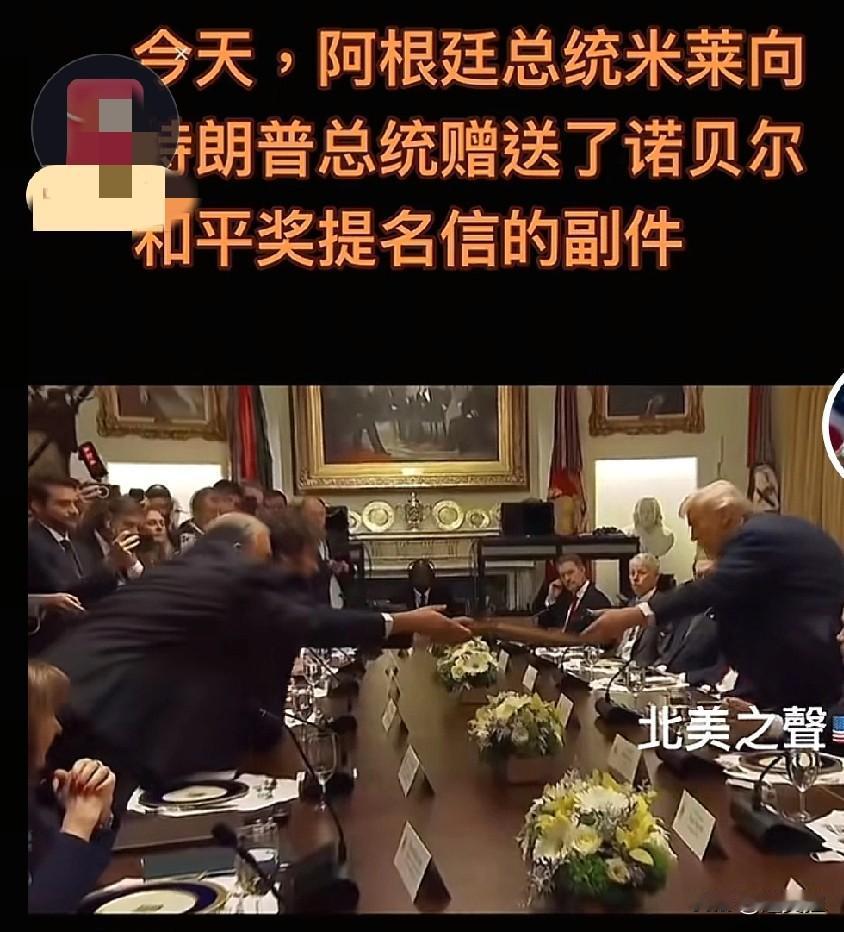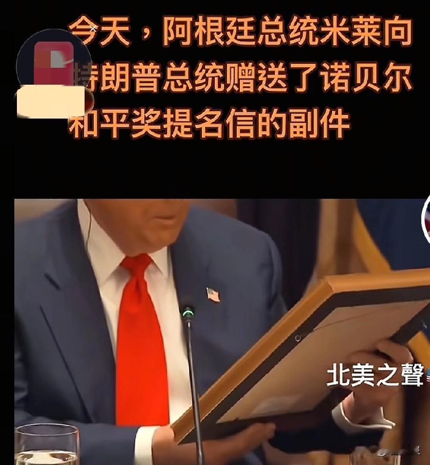 阿根廷的总统米莱真的有一件诺贝尔和平奖提名信,他在与特朗普会见时亲手将副件交给了特朗普。拍马屁的不少,米莱本就崇拜特朗普。也见怪不怪。据报道中东和平协议还未签署,这件提名信就有了。我觉得还是阿根廷不想让美国欺负它,毕竟南美加勒比这些地区,美国的手臂能够伸过去,看看近邻墨西哥巴拿马不都遭殃了,委内瑞拉和古巴几乎是美国要灭国的对象。门罗主义出台后,至今仍在继续。看看特朗普能不能劝劝阿根廷不卖大豆给我们,那才是有本事。