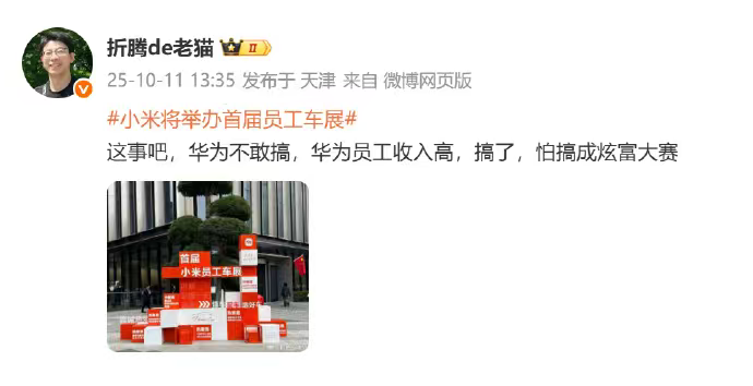 小米只不过办个员工车展,没想到这也搞成了对立!最关键的是华为也不造车,如果搞了车展就很奇怪了。再说了网上很多博主都是不太喜欢小米,但是他们为啥一天到晚去关注小米的消息呢?到底咋回事?有的时候我就想,这些博主网上说小米不好,没准线下就买小米产品。所以我觉得尽量不要听这些博主说什么,因为他们都在是玩流量。