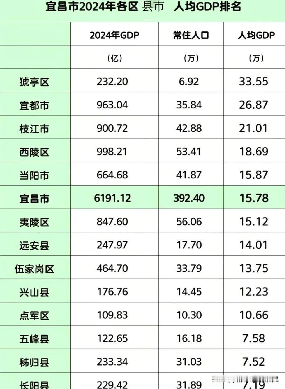 2024年宜昌市各区县市人均GDP排名情况,琥亭区人均GDP排名榜一,宜都市人均GDP排名榜二,枝江市人均GDP排名榜三,琥亭区宜都市枝江市的人均GDP排名最高,这三个区市人均GDP都达到了21万亿元人民币以上的水平,从图片整体数据来看宜昌各区县市人均GDP水平还是挺不错的。