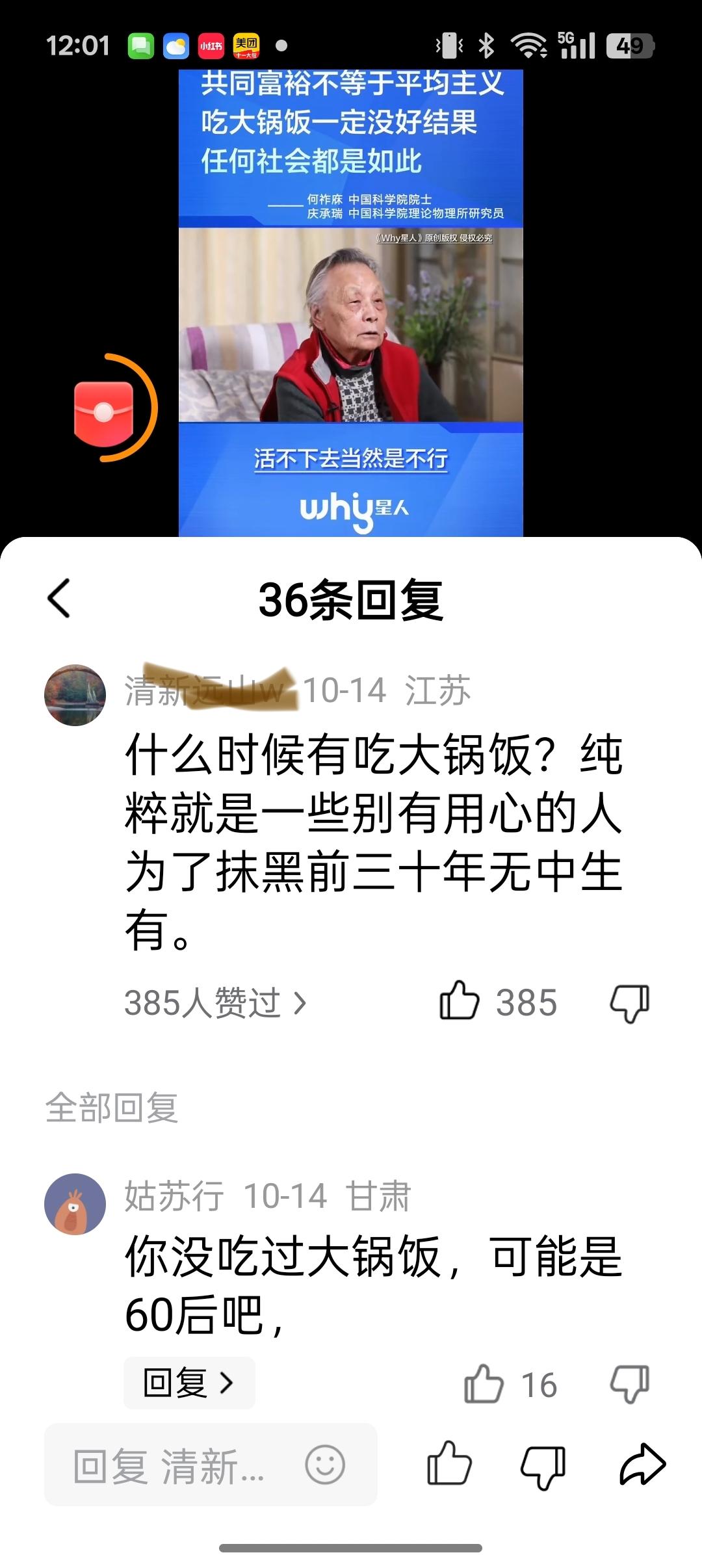 刷到何祚庥老伴庆承瑞的一个批判“大锅饭”的视频,有两个反对庆教授的网友发表了高论