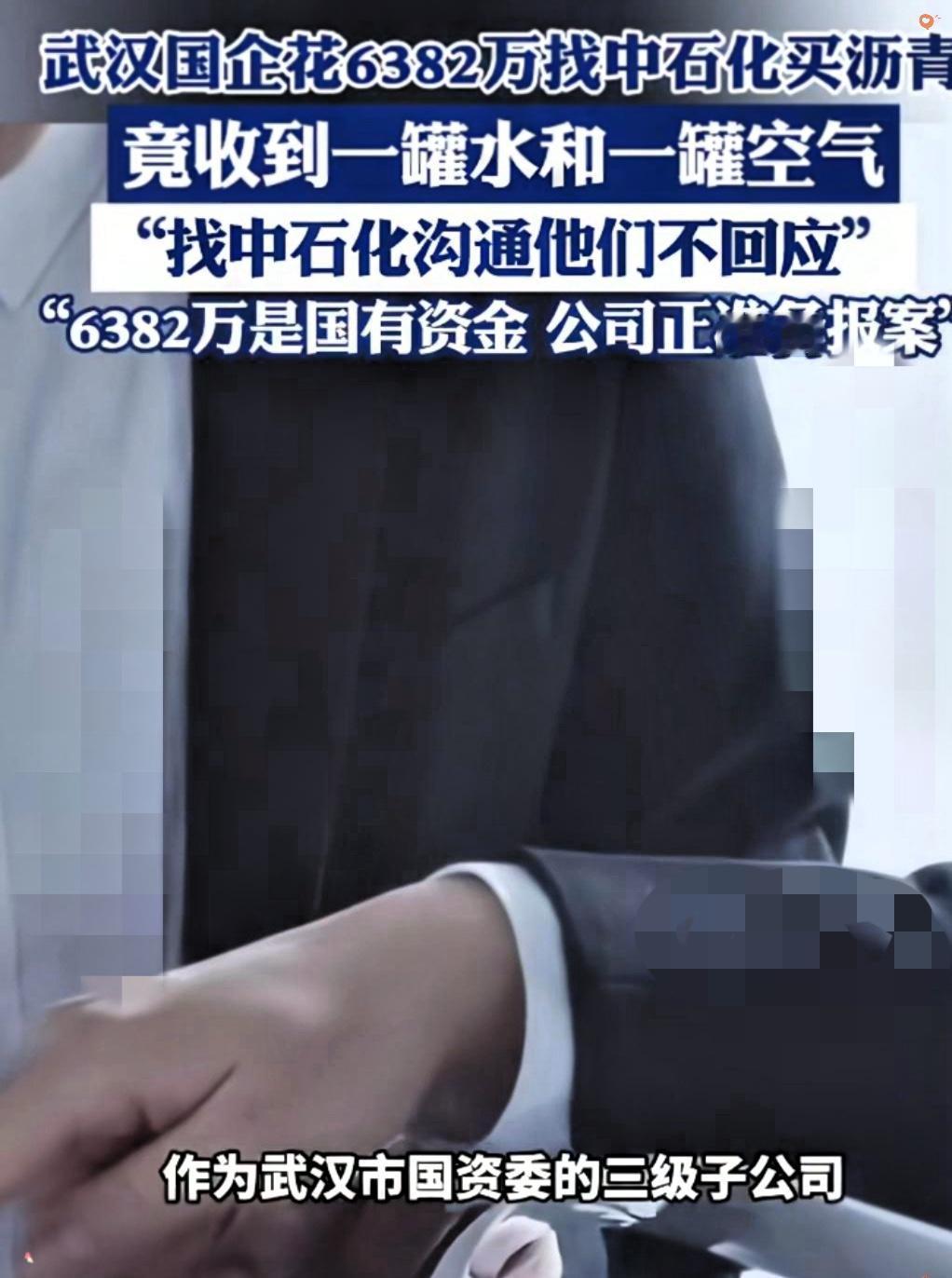 黑吃黑的见的多,白吃白倒是少见! 武汉一国企耗费6382万元,找中石化买沥青,结果却收到了一罐水和一罐空气,这是什么操作?! 这算不算光明正大的搞欺诈,不仅货不对版,钱也被收了,这两家国企之间存在矛盾,才导致这样的问题出现,如今,该事件已被各大媒体报道,谁要为此负责呢?! 最让人费解的不是“送水送空气”,而是6382万的大单子,居然能让这种离谱的货蒙混过关。 按理说国企采购流程比普通公司严多了,从下单到验收层层把关,怎么到这儿就像没人管似的? 别说是“矛盾”导致的,矛盾归矛盾,也不能拿国家资产和项目当儿戏。 这事儿要是查不清、没人担责,以后谁还信国企采购的靠谱性? 你们觉得,是流程上的漏洞太大,还是有人在中间“放水”才让这种荒唐事发生?