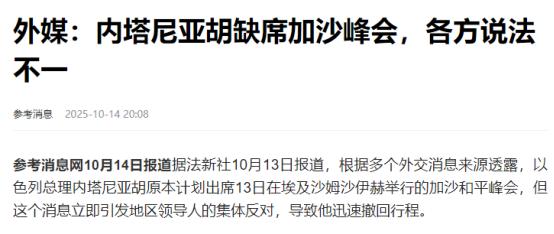 “遭集体反对,内塔尼亚胡迅速撤回行程” 据法新社10月13日报道,根据多个外交消息来源透露,以色列总理内塔尼亚胡原本计划出席13日在埃及沙姆沙伊赫举行的加沙和平峰会,但这个消息立即引发地区领导人的集体反对,导致他迅速撤回行程。 这次峰会是埃及总统塞西和美国前总统特朗普一起主持的,本来是想推进加沙停火,还有战后怎么重建这些事儿——比如怎么让双方都别打了、交换被抓的人、以色列从加沙撤军,还有让人道主义援助能进加沙之类的。 可等以色列的公共广播公司说内塔尼亚胡要去参会之后,阿拉伯国家和伊斯兰国家立马就炸了锅。 土耳其总统埃尔多安反应最冲。他当时专机都快降落到埃及了,一听说内塔尼亚胡要去,直接放话“有他没我”,说要是内塔尼亚胡敢来,他的专机立马掉头回安卡拉。 后来土耳其《每日晨报》还说,埃尔多安的专机真就在红海上空绕了好几个小时,就是用这办法施压。不光土耳其,伊拉克也跟着表态,伊拉克总理的顾问穆萨维明明白白说,内塔尼亚胡要是来,伊拉克就退出峰会。 还有黎巴嫩、叙利亚那些没正式承认以色列的国家,也通过外交渠道说不满,说不想跟以色列领导人站一块儿拍照。 埃及作为东道主,这下可太为难了。有消息说,埃及私下跟以色列提过,内塔尼亚胡要是来,可能会让不少代表团抵制峰会,连峰会算不算数都得打问号。 美国这边态度也变了,之前特朗普去以色列的时候,还公开说支持内塔尼亚胡去,跟塞西也说好同意了,结果土耳其这些国家一施压,白宫就赶紧跟以色列紧急商量,让他们找个台阶下,别去了。 最后内塔尼亚胡办公室找了个理由,说“犹太教的西赫托拉节晚上开始”,所以不去了。这理由谁都不信啊,因为节日时间跟峰会根本不冲突。 以色列第12频道电视台直接戳破了,说其实是内塔尼亚胡怕跟巴勒斯坦总统阿巴斯、埃尔多安这些人一块儿开会,会惹恼国内的右翼势力——毕竟他现在还面临司法调查,正是敏感的时候。 他所在的利库德集团里已经有人批评了,说跟阿拉伯领导人直接对话,可能会被当成对哈马斯妥协,那麻烦就大了。 这事儿也能看出来,以色列在中东的外交是真没辙。就算美国想帮它撑场面,阿拉伯国家一起反对,内塔尼亚胡也只能退。 土耳其是北约国家,又是地区军事强国,这次说话特别有分量,埃尔多安这么做,也是想巩固自己在伊斯兰世界的地位,同时跟美国递话:“中东的事儿不能让以色列一个人说了算”。 最后峰会是埃及、美国、土耳其、卡塔尔四个国家的领导人签了《加沙停火协议全面文件》,说要保证协议能执行,还要推进战后怎么管加沙。 有意思的是,这份文件里没提以色列的安全需求,反而强调“两国方案”才是解决巴以问题的唯一办法。巴勒斯坦总统阿巴斯虽然去了峰会,但没跟任何以色列代表见面,能看出来两边还是对着干的状态。 内塔尼亚胡这次没去成,也能看出特朗普那个“20点和平计划”不顶用。那个计划本来想靠给巴勒斯坦点经济好处,让他们让步,却没管巴勒斯坦最在意的政治主权问题,所以阿拉伯国家都不信。 峰会期间特朗普还说要成立“和平委员会”监督加沙重建,可没说具体怎么干,反而一个劲儿说加沙不能有军队,这跟巴勒斯坦的要求完全对不上。 这事儿对中东的影响也不小。对以色列来说,跟土耳其、埃及这些以前还算能说上话的国家,关系更差了,孤立得更厉害。美国想主导中东和平,又没做成,能看出它现在影响力也没那么大了。 倒是土耳其和埃及,通过这次峰会,在地区事务里说话更有分量了,尤其是土耳其,在伊斯兰世界的领导力更稳了。 还有就是,埃及已经说要开加沙重建的国际会议,以色列会不会改改它那强硬的态度去参加,现在还说不好。 哈马斯虽然没去峰会,但通过释放被抓的人这些事儿,也间接影响了峰会的走向,它在加沙实际能管多少地方,以后谈判的时候也是个关键。 内塔尼亚胡这次没去成峰会,不光是他个人外交没做好,更能看出以色列在中东这边越来越孤立了。阿拉伯国家这次一起反对,就是想表明:要是不考虑巴勒斯坦的利益,任何和平方案都站不住脚。 以色列要是还想着自己说了算,以后想跟地区国家合作就更难了。这事儿也提醒大家,要解决巴以问题,还得回到“两国方案”,大家坐下来好好谈,才能有长久的和平。