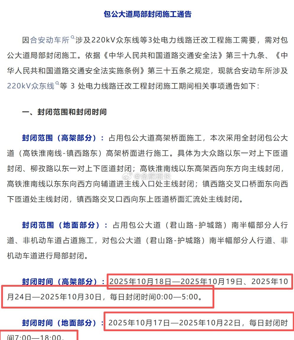 包公大道局部将封闭施工! 因合安动车所涉及220kV众东线等3处电力线路迁改工程施工需要,需对包公大道局部封闭施工。