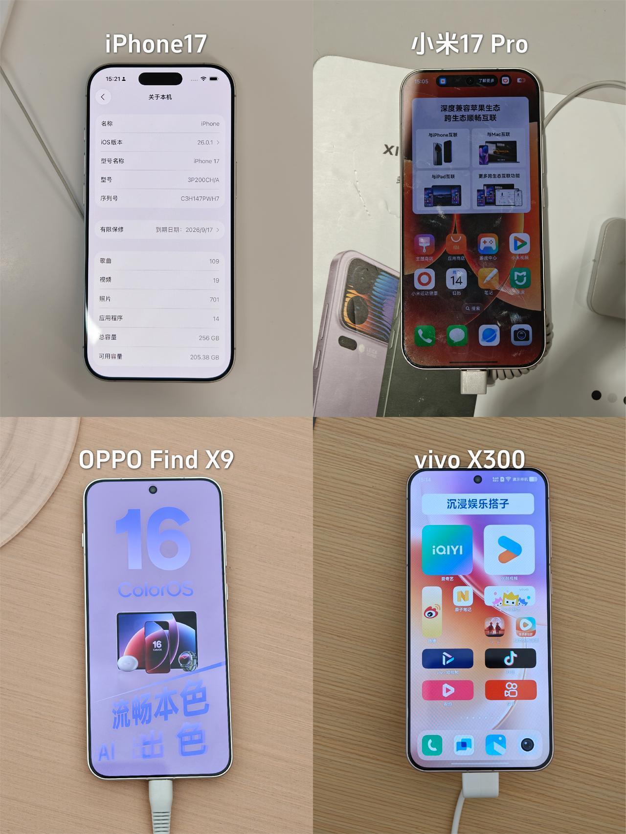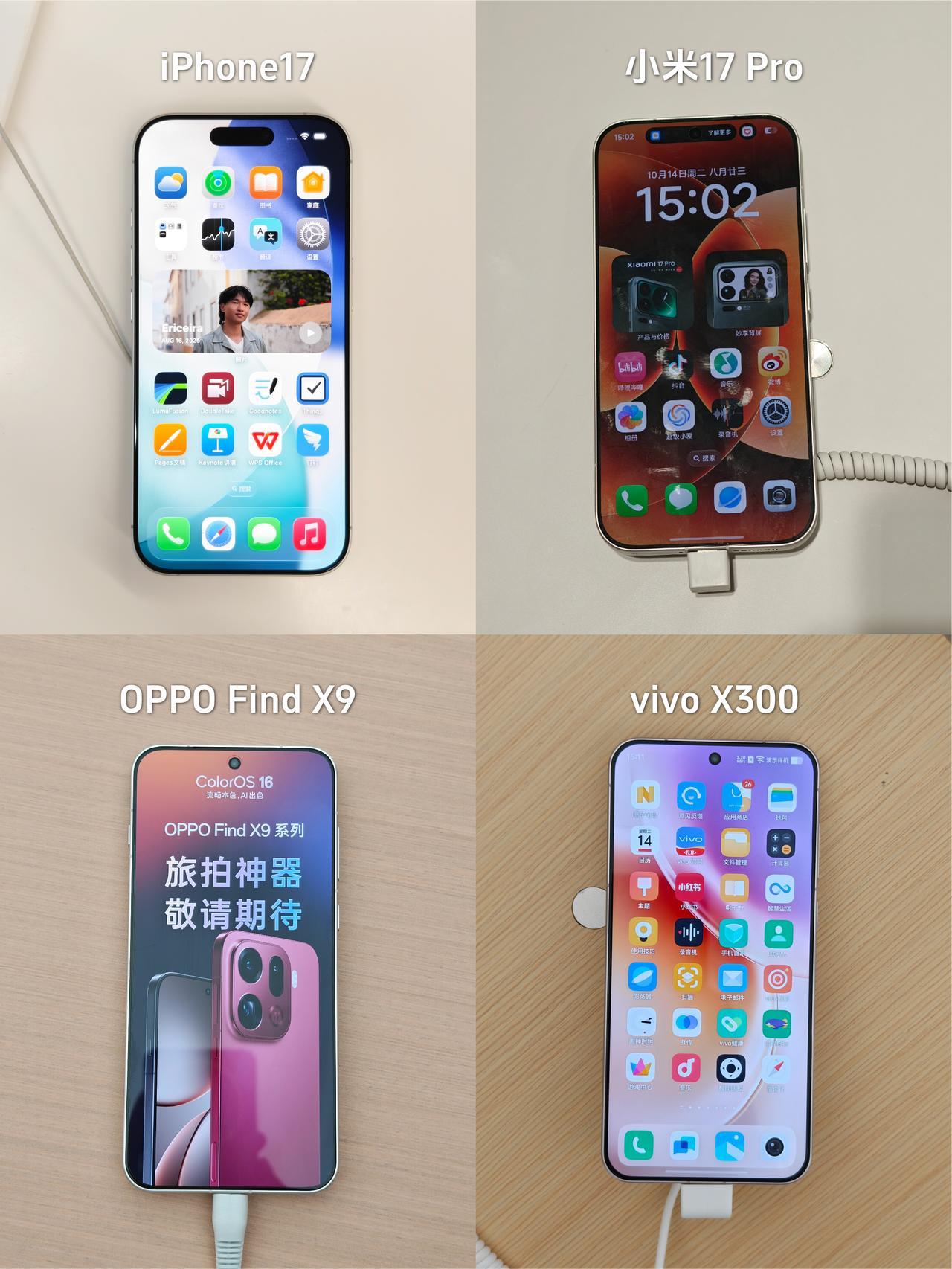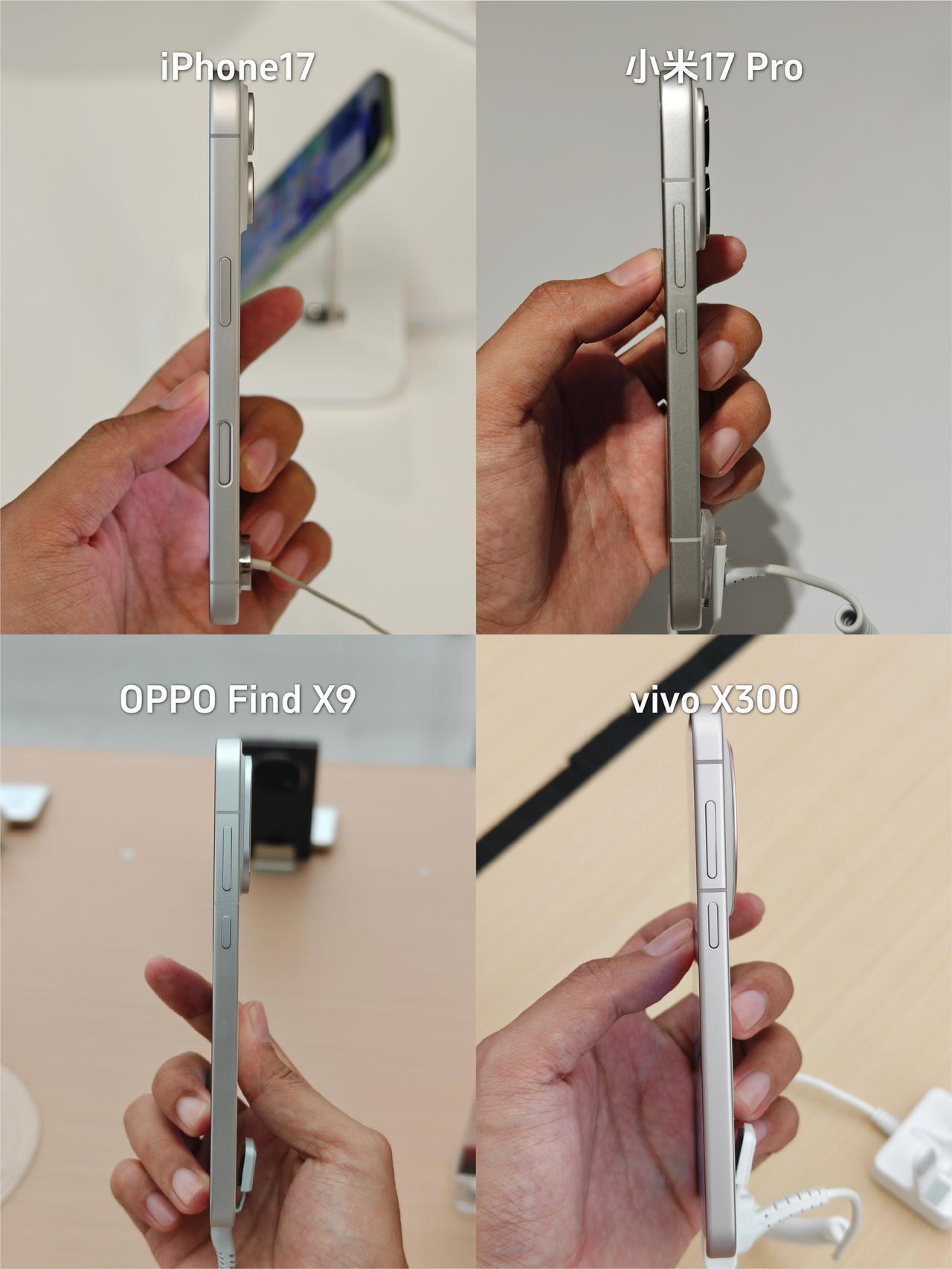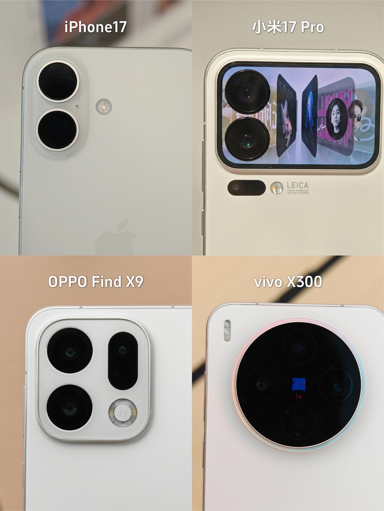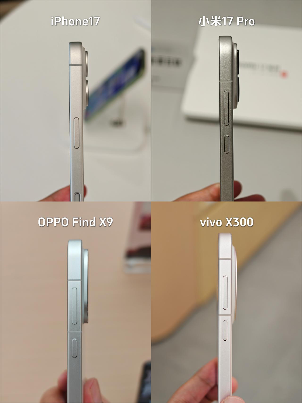 果米OV中杯旗舰做足功课,坐等换机 双11准备换新手机了,我的iPhone13电池都扛不住了😭 💰预算有点紧,所以目标锁定各家中杯旗舰,特意去线下摸了个遍,来说说最直观的感受: 1⃣️iPhone 17: 经典白色还是那个味,钛金属直角边+磨砂玻璃背板,质感很高级,配色多,新出的紫色确实好看,就是电池太小,续航还是那样... 2⃣️小米17 Pro: 背屏设计很特别,握持感还可以,最吸睛的是那块智能背屏,能显示通知、玩自定义图案,可好玩了,就是在想两块屏幕会不会比较耗电🤔 3⃣️vivo X300: 经典圆形蔡司镜头,继承前面X100系列、X200系列的设计风格,大圆设计比较对称就是有点看腻了,还有就是大圆设计导致续航不够,三家国产旗舰里电池最小,续航焦虑?😐 4⃣️OPPO Find X9:冷雕玻璃+绒砂工艺,不仅看着更精致,背面手感、触感也贼舒服,是几台里最贴手的,哈苏标和摄像头Deco 融合得很好,很协调。喜欢这个白色,简洁大方很百搭,正面的屏幕边框精致感很足,还护眼 🤔发现今年国产屏黑边都窄得离谱,参数上 vivo (1.05mm) 最窄,但不知为啥,我看着小米 (1.18mm) 和 OPPO (1.15mm) 的视觉黑边反而更窄?是我的错觉吗? 💡综合看下来,我倾向米17 Pro或Find X9。小米背屏好玩,OPPO手感好,还有哈苏四摄,拍照也靠谱,关键这Find X9的电池都上了7000mAh+,续航焦虑直接没了!❓大家说我该选哪个? 数码爱好者iPhone17双十一小米OPPO Find X9