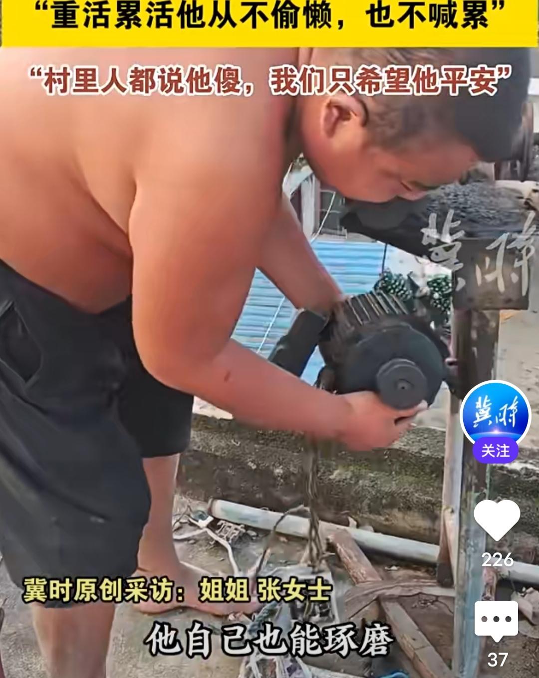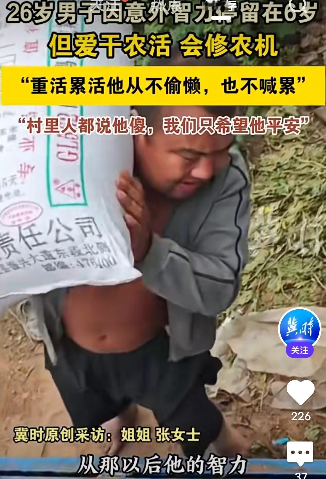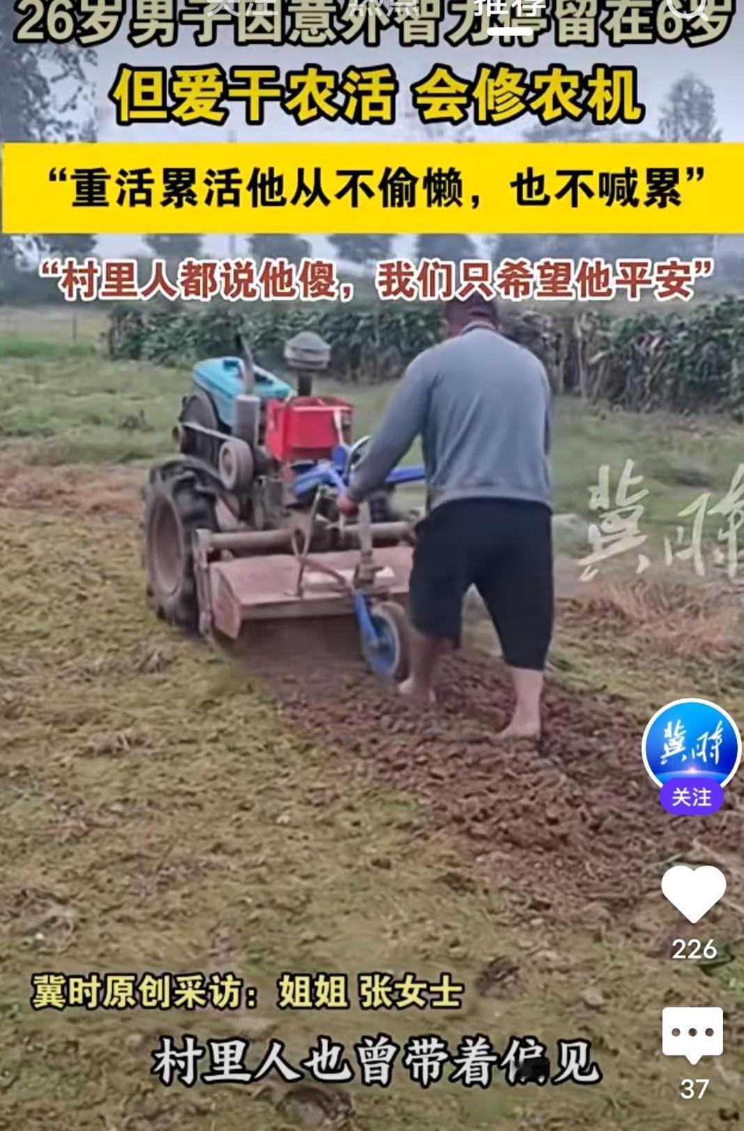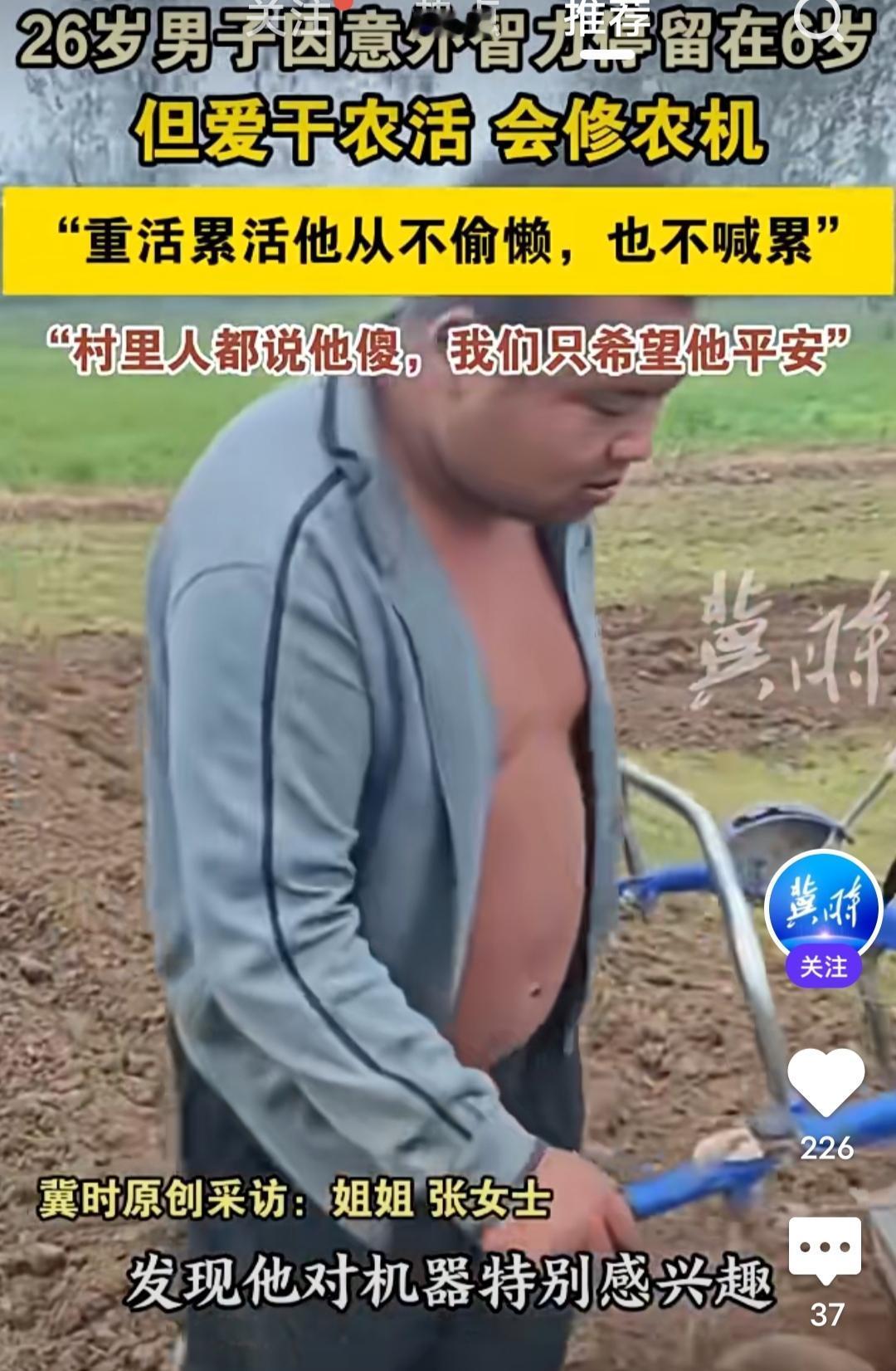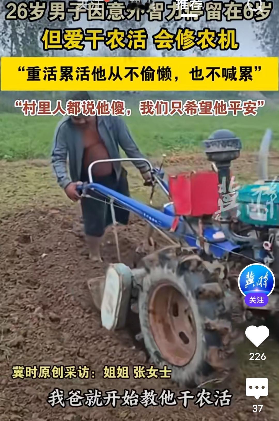 26岁男子因意外智力停留在6岁,但爱干农活会修农机“重活累活他从不偷懒,也不喊累”“村里人都说他傻,家人只希望他平安” 河南信阳的26岁小伙张先生,在六七岁的时候,跟爷爷奶奶去平房上晒稻谷,不小心摔了下来,智力也就停留在那个年龄了,从此村里人也对这个孩子说三道四,带着偏见。 到他十三四岁的时候,他父亲就开始教他干农活,他都干得很好呢,扛一整袋粮食,收稻谷等,脏活累活从不偷懒,虽然他跟常人不一样,但是父亲交给他的任务,他总会记得,头条干不完的,第二天会早早起床去干。 他还对农机特别感兴趣,像什么犁地机,坏了他会去自己琢磨,自己修,而且能很快修好,从视频里看到他的笑容,真的觉得是很可爱的一个男孩子。 虽然他的智力跟常人不一样,但是他内心单纯,干净,他的家人们只希望他健康平安,是的啊,健康平安最重要,祝愿这个单纯的大男孩永远平安健康快乐!