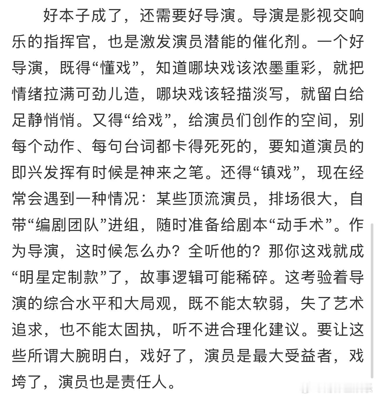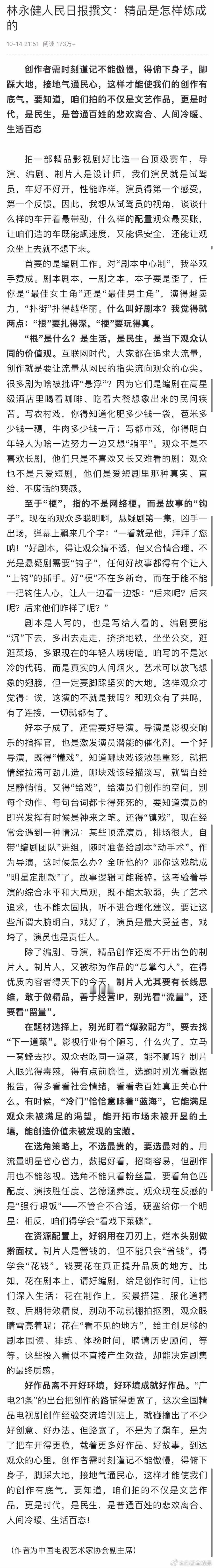 林永健人民日报发文批某顶流演员排场大14日,《人民日报》刊发了中国电视艺术家协会副主席的文章《精品是怎样炼成的》。文中提到,现在经常会遇到一种情况:某些顶流演员,排场很大,自带“编剧团队”进组,随时准备给剧本“动手术”。