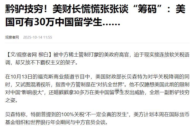美财长上演“美式服软”:美国还想和中方继续谈判,30万在美中国留学生就是“人质” 13日美国财长贝森特的采访算是把“美式双标”玩明白了,典型的先装委屈再卖好,最后亮刀子,一套流程下来把“霸权话术”耍得溜熟。这位被特朗普提名的亿万富翁财长,本身是搞对冲基金出身的,按理说该懂点博弈的体面,可10月13号的采访一开口,还是那套老掉牙的套路。 先说甩锅这步,贝森特在镜头前翻来覆去强调“是中国没有控制住局面”“是中国在对抗全世界”,把自己扮成受害者,说美国只是在“维护主权”。这话听着就好笑,谁在搞单边制裁心里没数吗? 从9月中美马德里经贸会谈结束到现在,才二十多天,美方就接连出台一堆对华限制措施,又是威胁加征100%关税,又是搞出口管制,这些都是摆在台面上的事实。 反观中方,10月9号出台的稀土新规,早在之前就通过双边机制给美方通报过,完全是按国际规矩办事,怎么到他嘴里就成了“对抗全世界”?这分明是倒打一耙,跟之前美方搞“50%穿透规则”时的霸道劲儿如出一辙。 甩完锅立马转画风,开始装“宽宏大量”。贝森特话锋一转,说美国不一定真要对中国商品加征100%关税,更想通过谈判解决问题。还特意透露刚过去的周末中美聊了不少,这周中国官员去华盛顿开世界银行会议,双方还要接着谈,甚至提到10月底特朗普去韩国开APEC会可能见中方,他自己也会提前会晤中方高官。 这话听着挺有诚意,可转头想想,美方要是真有谈的心思,怎么一边放话一边还在加码限制?商务部14号都挑明了:“不能一边要谈,一边威胁恐吓出台新措施”,这根本不是跟人相处的正道。说白了,这就是打不过就喊停,等缓过来再接着打的套路,跟之前搞稀土制裁时给盟友留缓冲期、独坑中国的操作一模一样。 最让人不齿的是最后的威胁环节,前面铺垫了半天“愿意谈”,末了突然翻脸说要是中方不配合,美国有的是“有效筹码”。他列举了丙烷、喷气发动机零部件这些东西,说都能当反制武器。 可这点筹码真能吓到人吗?早几年美方就拿丙烷试过水,结果中方600亿反制清单里直接就把这类产品列进去了,精准打击还不伤人害己。至于喷气发动机,更离不开中国稀土,现在稀土新规卡着,美国军工企业库存都快见底了,洛克希德・马丁这些巨头上周还在给国会写信求豁免呢。拿这些自己都依赖的东西当筹码,简直是自曝其短。 更过分的是,贝森特居然暗示要打留学生的主意,说美国国内有30万中国留学生,不排除驱逐的可能。这哪是什么筹码,分明是把无辜学生当“人质”。 这些孩子去美国读书是为了求学,跟经贸摩擦八竿子打不着,现在却成了美方政治博弈的牺牲品。这种拿普通人开刀的做法,连基本的道义都不讲,也难怪外界都说美方的霸权思维已经深入骨髓了——之前挑拨中阿关系被中方使馆痛批“霸权霸凌”,现在又拿留学生说事,真是一点底线都没有。 其实贝森特这套“服软+威胁”的组合拳,根本掩不住美方的底气不足。中方早就把话挑明了:“打,奉陪到底;谈,大门敞开”。14号的时候,中美工作层还在沟通,中方从来没把谈判的门关上,但前提是相互尊重,不能搞胁迫。 反观美方,一边喊着要谈,一边还在搞单边制裁,连贝森特自己都承认美国给阿根廷钱的核心是“维持战略利益”,这种满脑子霸权算计的心态,怎么可能谈出结果? 现在全球供应链本来就够脆弱了,美方前阵子搞“股权穿透”制裁,把几千家中国企业拖下水,已经让半导体行业乱成一团。现在又拿关税、留学生说事,只会让更多国家看清美国的真面目。 中方手里的牌也没打满,前三季度对美稀土合金出口降了32%,份额早被欧盟、东盟接走了,真要逼急了,有的是反制办法。 贝森特要是真为美国经济着想,与其琢磨怎么拿留学生当筹码,不如赶紧劝白宫停了那些单边措施——毕竟标普都算过,稀土管制要是收紧,美国四大行业明年成本得涨290亿,GDP都得掉0.3个百分点,再折腾下去,受伤的还是美国自己。