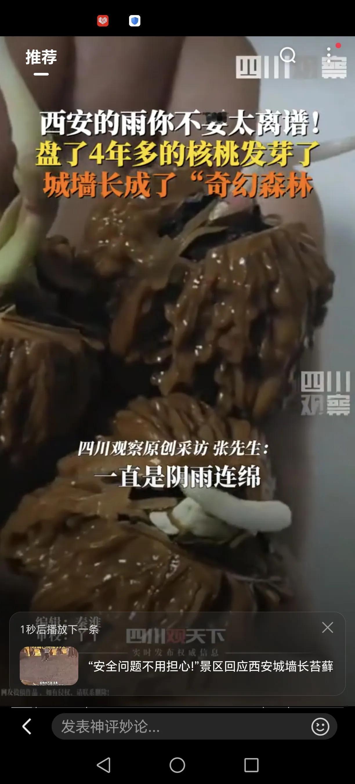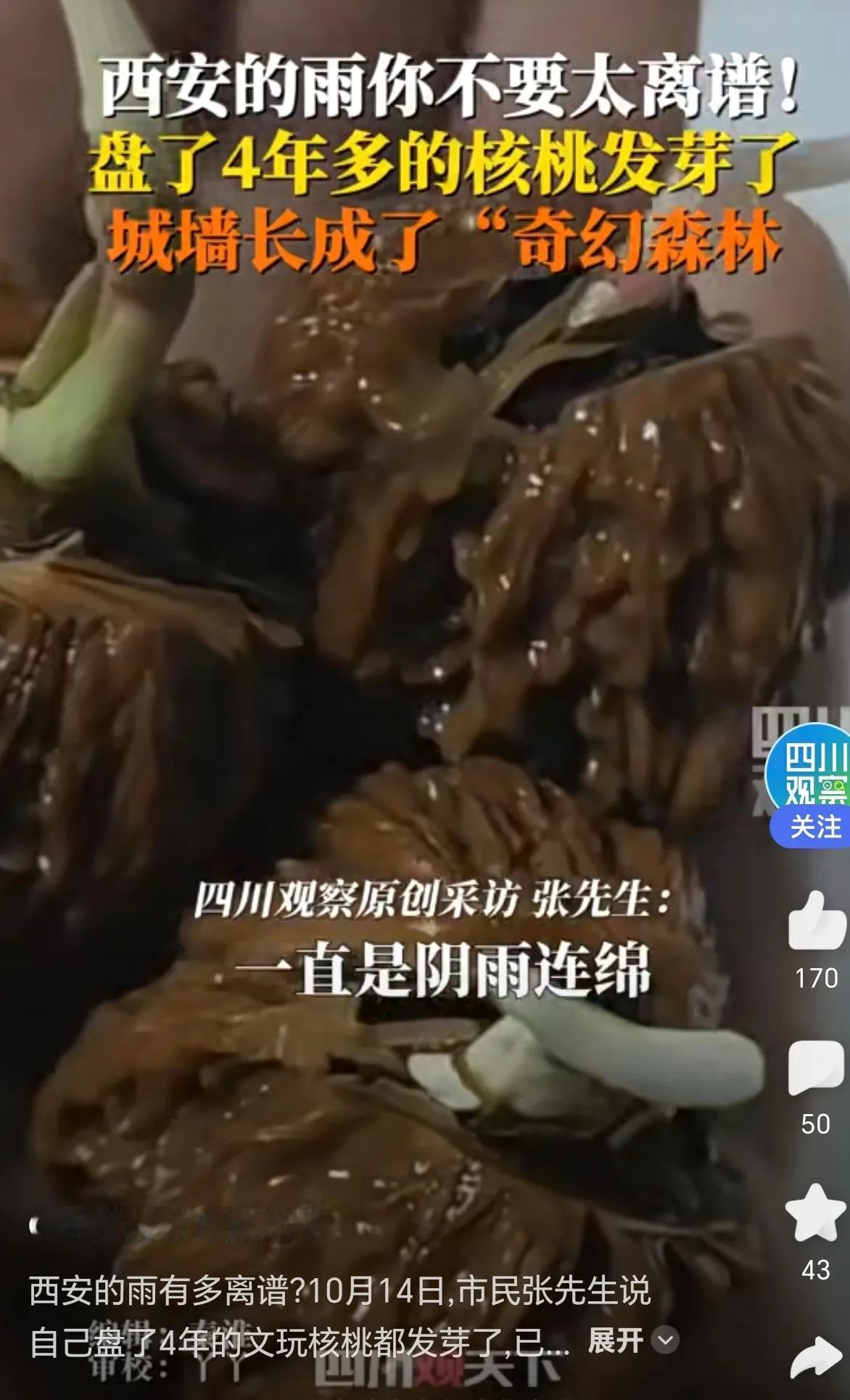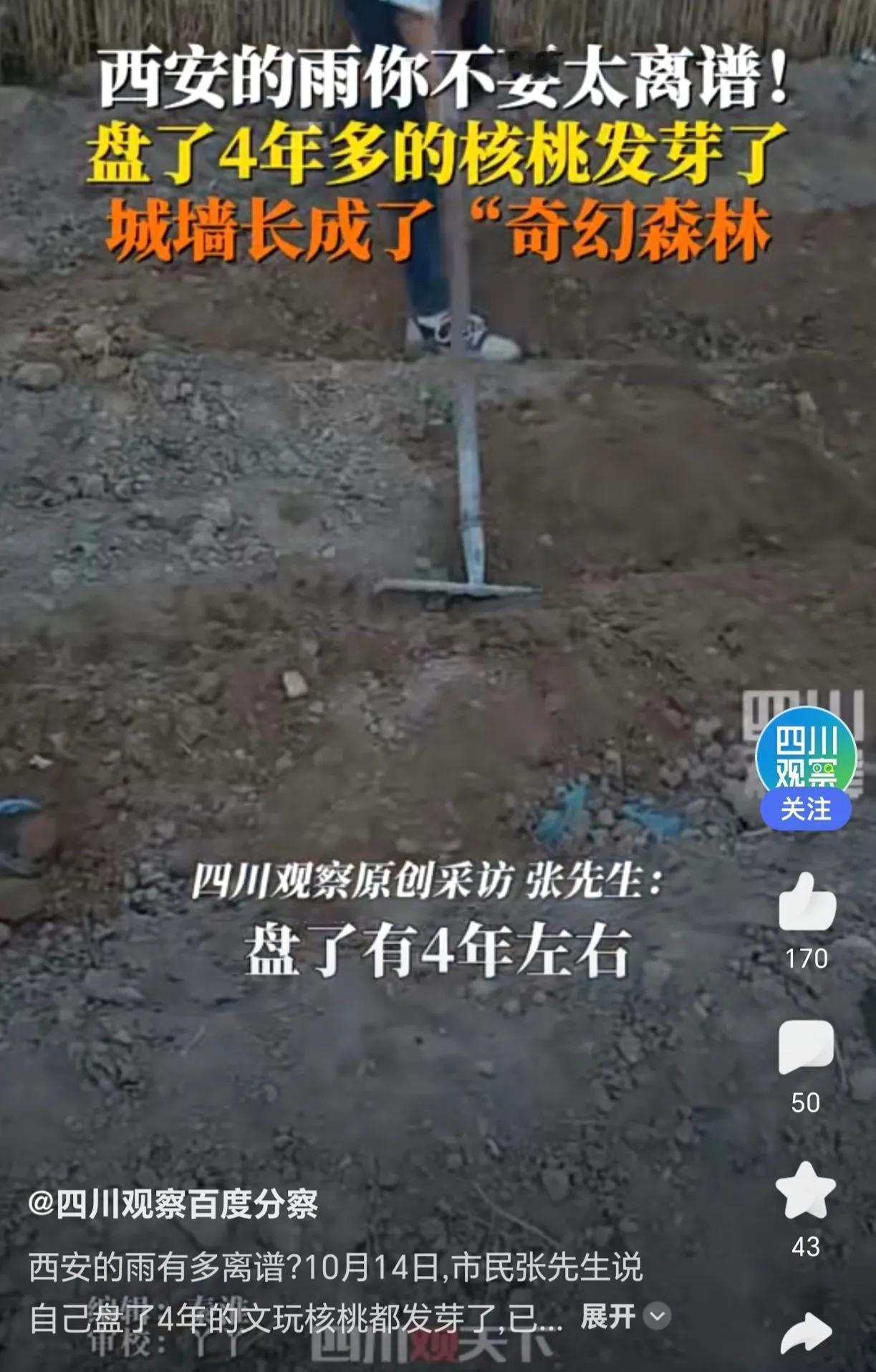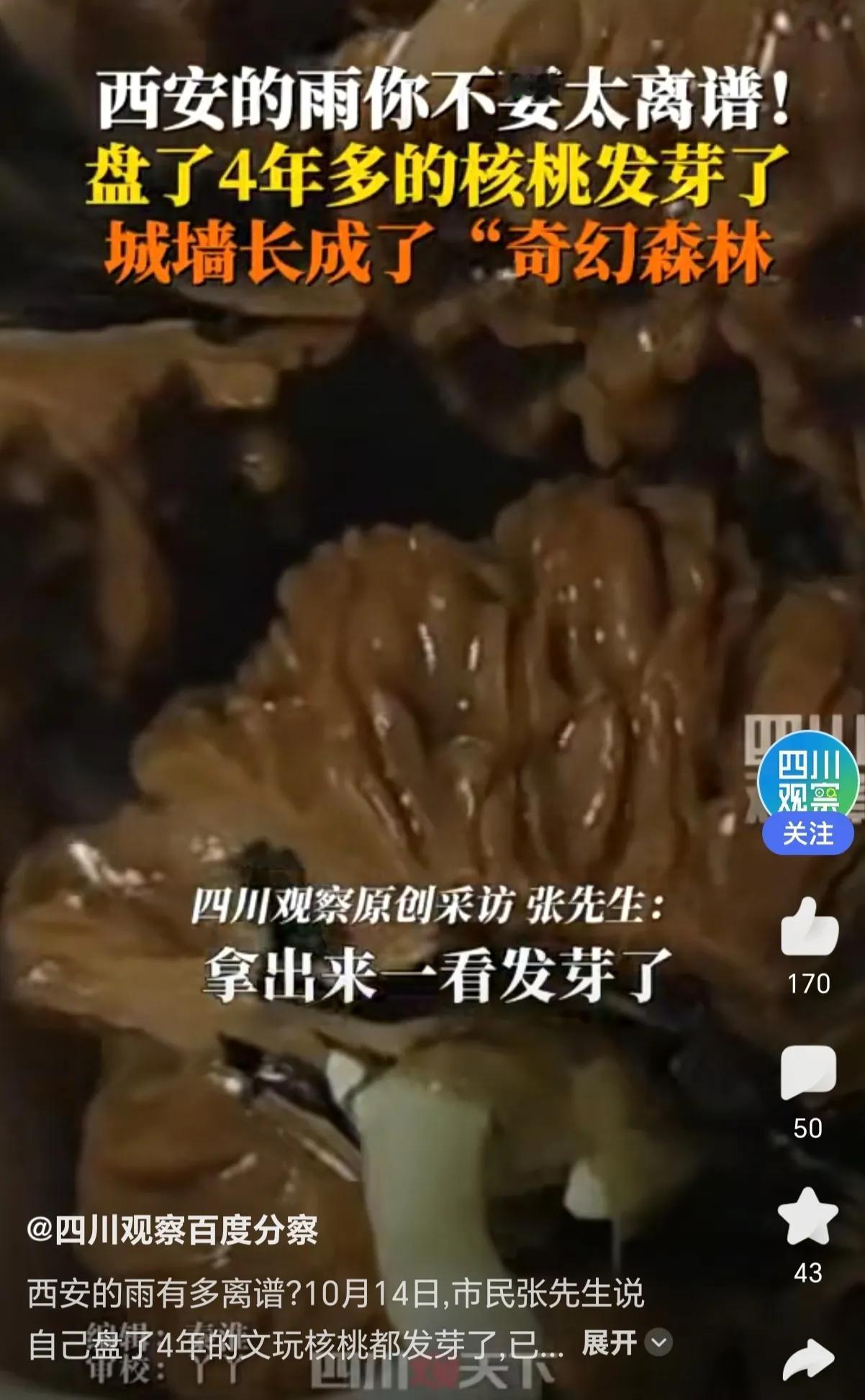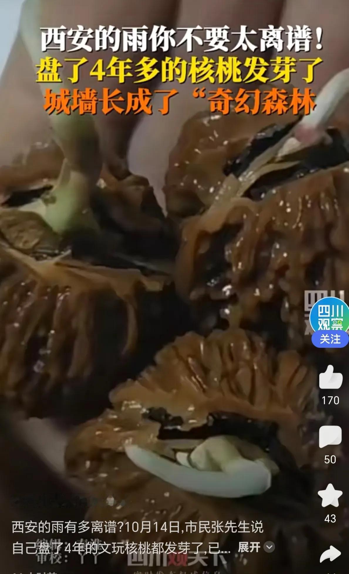 西安连阴雨创纪录!男子盘玩4年的文玩核桃竟发芽,已入土种植 近日,西安持续40余天的异常阴雨天气,不仅让古城墙披上了"绿衣",更引发了一桩奇闻——市民张先生精心盘玩4年的文玩核桃竟在潮湿环境中悄然发芽! 这只被主人视若珍宝的核桃,经过近1500个日夜的细心盘玩,本已包浆浑厚、色泽温润。没想到连绵阴雨让室内湿度持续偏高,核桃在不知不觉中焕发生机。发现这一幕的张先生既惊讶又不舍,最终决定将这颗"觉醒"的核桃栽种入土,期待它能长成参天大树。 异常的潮湿天气还给西安带来了其他变化:古城墙上青苔密布,仿佛披上了绿色薄纱;各大公园里蘑菇争先恐后破土而出,成为一道别样风景。气象专家表示,这样长时间的持续阴雨在西安气象史上实属罕见。 网友趣评:"这核桃是有多想不开,放弃文玩身份非要当树苗"、"西安这是要变身江南水乡?" 西安奇闻 天气那些事 (消息来源:媒体报道)
