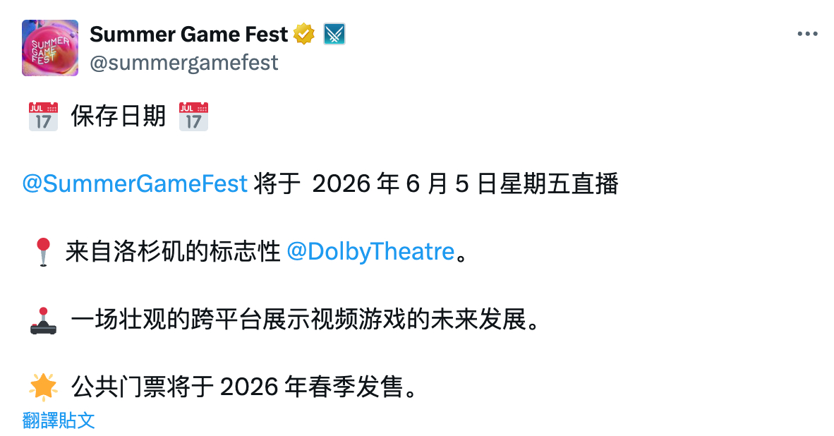 「夏日游戏节」官方宣布将于2026年6月5日在美国洛杉矶杜比剧院举行下一届游戏节。继续由Geoff Keighley主持,TGA团队担任制作,并在2026年春季开启售票。夏日游戏节