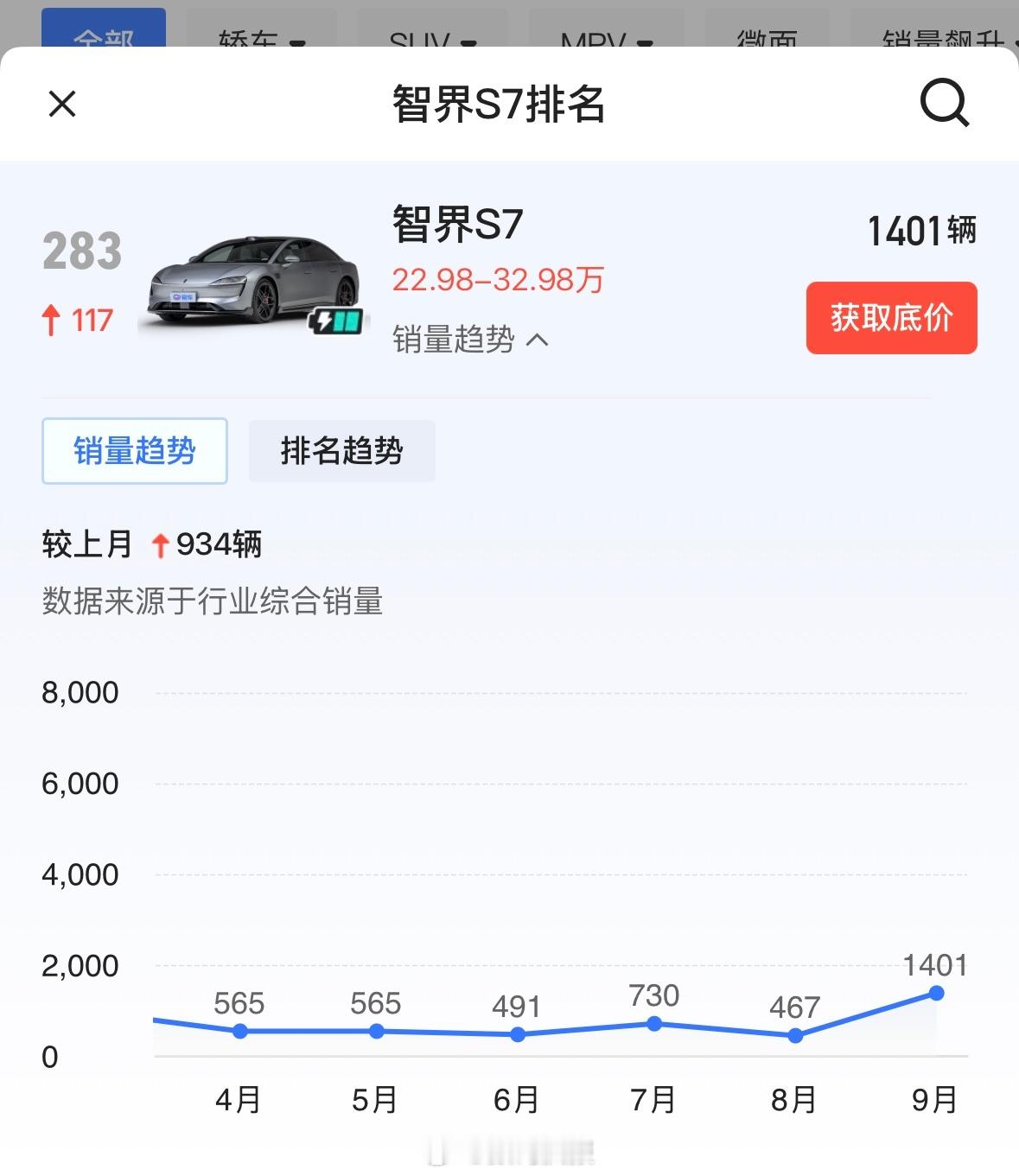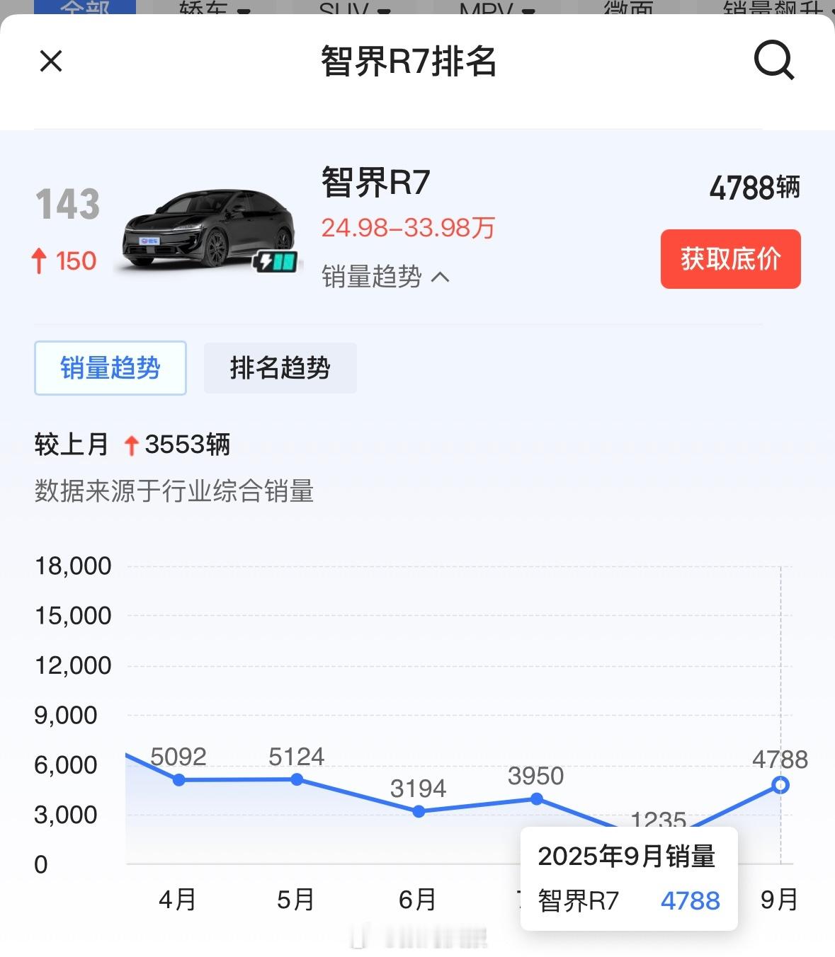 2025年1-9月智界S7销量为7104辆