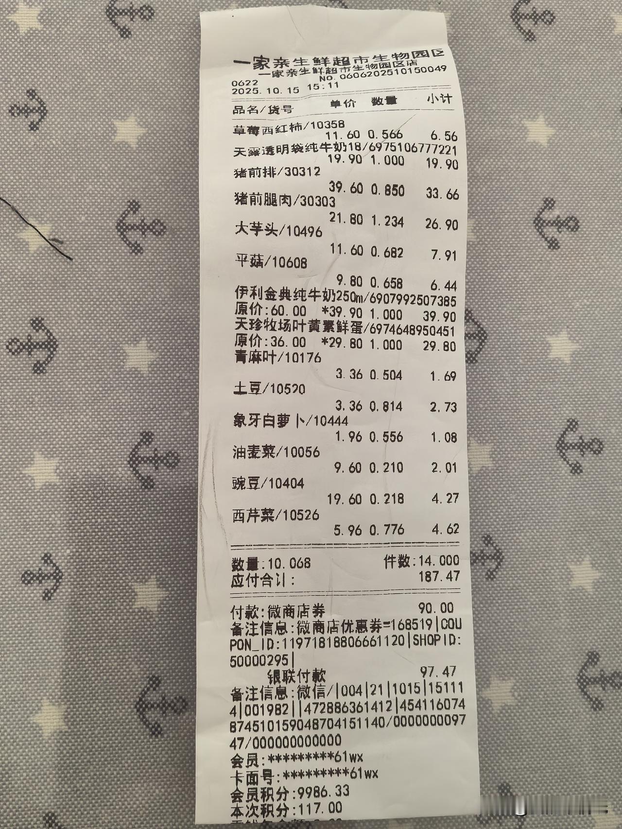 今天下午到西宁“一家亲生物园店”买菜,顺便还兑换了积分,省了几个钱。 这家超市的肉分类很细致,软骨、排骨、大骨都分得清清楚楚,价格也各不相同。前腿肉一斤10.9元,猪前排一斤19.8元,普通猪排15.8元,精排骨则要24.8元。我买了一些前腿肉和猪前排,一共花了六十多块钱。 另外还选了一板叶黄素鲜蛋,29.8元;一棵青麻叶1.69元;土豆每斤1.68元,再加上牛奶和其他几样蔬菜。所有东西加起来,总共消费187.47元。 结账时,用12000积分抵扣了90元,实际支付97.47元。 对该店的肉蛋价格你怎么看? 秋日生活打卡季