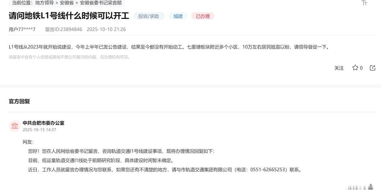 合肥轻轨L1号线从2023年就开始说建设,今年上半年已发公告建设,结果至今都没有开始动工。 官方回复,目前,低运量轨道交通l1线处于前期研究阶段,具体建设时间暂未确定。 目前这个情况,地铁和轻轨在纸上的短期内还是要在纸上。