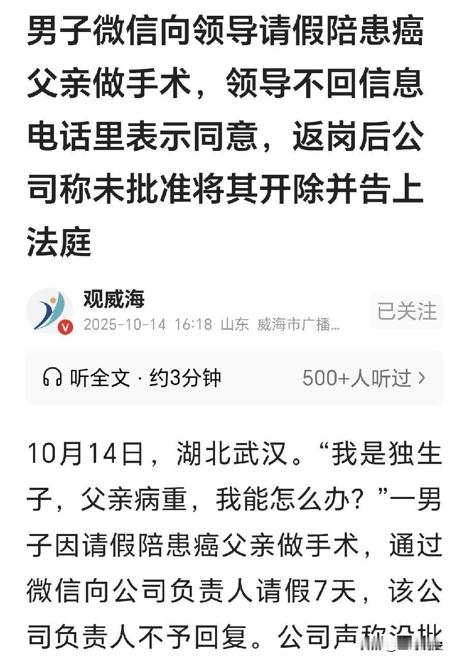 谁家没有老人?湖北武汉,一男子是独生子,父亲患癌要做手术,男子通过V信向经理说明情况,请假7天,陪父亲做手术,经理没回复,男子又打电话向经理请假,事后,公司说男子无故旷工,将男子开除,男子认为,公司违法解除合同,经劳动仲裁,裁决公司须支付赔偿金和工资差额,公司不服,把男子告上法庭,认为公司不应支付赔偿金,法院判了! 王先生听到法院判决的那一刻,热泪盈眶,自己的委屈倾泻而出。 原来,王先生在2021年10月,在某建筑公司应聘入职,一直以来,他担任的职位是采购专员。 王先生在职期间,恪守公司的规章制度,他兢兢业业,在自己的职位上尽心尽责。 王先生知道,这份工作来之不易,他十分珍惜,他努力工作,希望有一天能够升职加薪。 王先生是家中的独子,家中父母年纪大了,他们身体每况愈下,王先生是他们唯一的依靠,孝顺父母,是他的义务。 可天有不测风云,人有旦夕祸福,2024年刚过,王先生的父亲感到身体不适,到医院一查,不幸被确诊为肝癌晚期。 这个消息,瞬间将家人击垮,乌云罩顶,家人十分的痛苦。 医生建议,父亲需要立刻入院手术,家人打来电话,要求王先生立刻回家。 王先生心里着急,医院已经安排了手术,手术完毕,还要在进行一段时期的观察。 王先生归心似箭,父亲孱弱的样子瞬间在脑海里浮现,自己是独生子,从小到大,都是父亲的掌上明珠。 如今父亲患上癌症,王先生心如刀绞,恨不得插上翅膀,立刻飞到父亲身边。 3月15日晚上,王先生编辑了一条V信,发给了公司经理,他在信中说明,父亲病重、他是家中独子,家中无人协助照料。 他是父亲唯一的孩子,需要在周日这天,陪父亲做最后一次的手术。 王先生预计需请假7天左右,他又在信中向经理汇报了自己的工作安排,和工作进度。 王先生左等右等,没等到经理的回复,王先生等不及了,他必须即刻回家,父亲病危,已经等不及了。 王先生给经理打去了电话,说明情况之后,他向经理请假,陪伴父亲做完了手术。 谁知到了3月28日,工作群里发出了通知,说王先生从3月16日起,未到岗上班,即日起不再负责采购工作,相关工作交由他人处理。 通知一发,王先生发现,自己立刻就被踢出了工作群,到了4月,公司说他旷工,和他解除了劳动合同。 王先生愤怒,自己明明请了假了,可公司却说,是王先生在3月16日~3月28日期间,未经请假擅自旷工! 王先生解释,当时父亲病危,他已经向总经理打电话请假,说明了家里的情况,并且经理已经口头同意。 父亲的事情处理完毕,他就匆匆赶回,3月28日这天,他已经返回到了工作岗位。 而他在陪伴父亲期间,未出勤工作日实际是8天,王先生认为,公司这种做法,属于违法解除劳动合同。 因此,王先生认为,公司既然违法和他解除合同,就该赔偿他相应的赔偿金额和工资差额。 但公司并不这么认为,于是双方通过劳动仲裁,最终裁决,公司应对王先生给予经济赔偿和工资差额。 可公司不服,2024年10月,公司告到法院,要求法院判决,公司无需向王先生支付赔偿金和工资差额。 法院经过审理,发现王先生的确在父亲做手术前向经理请假,并说明了事由,王先生并非是无故旷工,而是向公司负责人请过假的。 此外,公司经理对王先生的请假请求并没有拒绝。 公司方面,也没有能拿出证明,证明公司已经告诉王先生关于公司的请假审批流程。 公司也没有在王先生请假期间,给予王先生返岗提醒。 因此法院认为,公司作为用人单位,在安排工作的同时,也应体恤员工的家庭困难。 《民法典》第1043条规定: 家庭应当树立优良家风,弘扬家庭美德,重视家庭文明建设,家庭成员间应当敬老爱幼,互相帮助,维护平等、和睦、文明的婚姻家庭关系。 王先生作为独子,在父亲患癌需要手术时,有义务照顾父亲,这符合民法典中家庭成员间互相帮助的规定。 公司在处理王先生请假事宜时,未考虑到其家庭特殊情况,违被了这一规定的要求。 《民法典》第1041条规定: 民事主体按照自己的意愿依法行使民事权利,不受干涉。 王先生向经理请假陪父亲做手术,是其行使自身权利的表现,且请假理由合理正当。 公司经理对其请假请求未拒绝,也未告知其请假流程不符合规定,却以旷工为由解除劳动合同,干涉了王先生依法行使权利。 《民法典》第1045条规定: 亲属包括配偶、血亲和姻亲。配偶、父母、子女、兄弟姐妹、祖父母、外祖父母、孙子女、外孙子女为近亲属。 王先生的父亲属于其近亲属,父亲患病需要照顾,王先生请假符合常理。 公司以旷工为由解除劳动合同,未考虑到王先生与父亲之间的亲属关系及由此产生的照顾义务。 法院判决,公司和王先生解除劳动合同的行为违法,经过核算,公司应支付王先生解除合同赔偿金共计33000元。 公司不服,提起上诉,2025年3月,二审法院判决,维持原判。 关注@王哥说法 多学法律少吃亏!