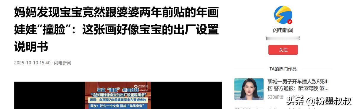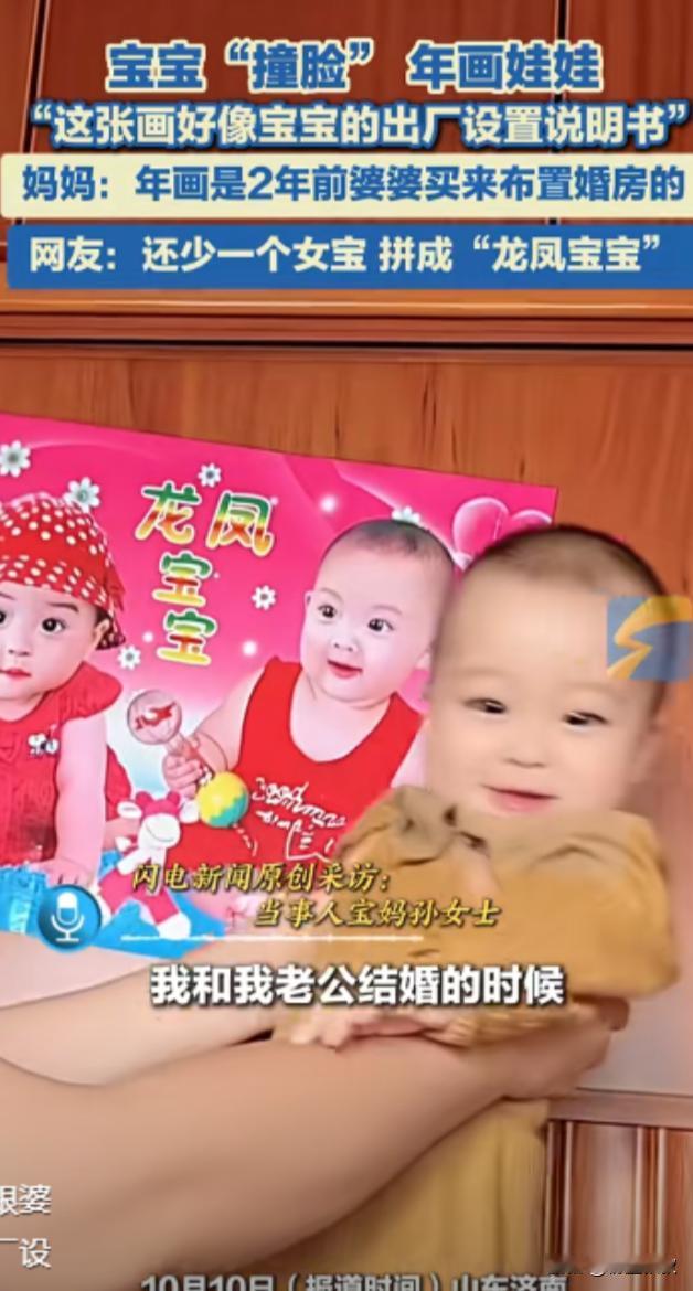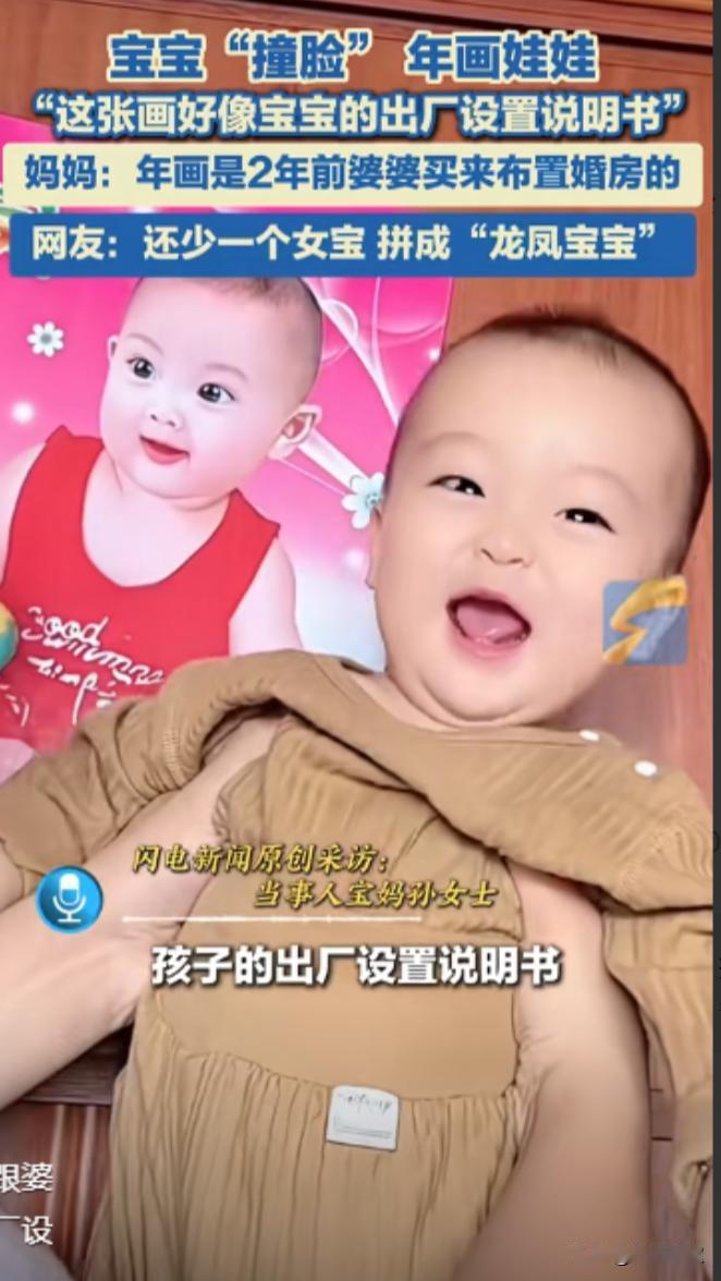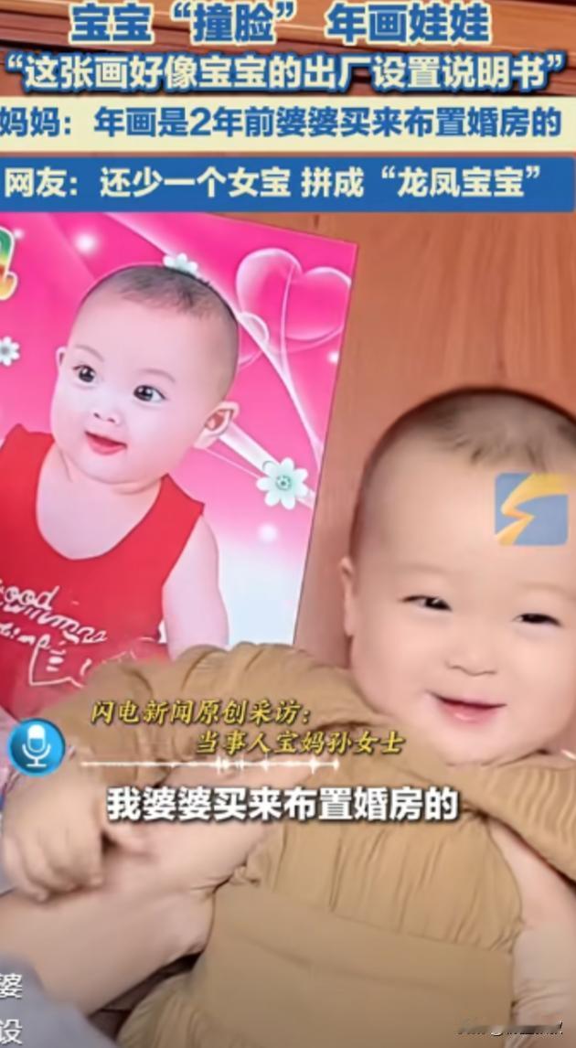 “这次科学解释不了!”山东济南,妈妈带宝宝回老家,发现宝宝居然跟婆婆两年前贴的年画娃娃“撞脸”!妈妈:“不能说一模一样,简直是一个模子刻出来的!相似度99%!”网友:真像,有点不科学了! 事儿是一个叫小苏的妈妈遇上的,前段时间她带着刚多大的宝宝回婆婆老家,本来就是寻常的回家看看,没想着会有啥特别的发现,结果刚进婆婆家屋,她抱着宝宝随口抬头一看,当场就愣住了,墙上贴着一幅年画娃娃,那娃娃咧着嘴笑,模样看着咋那么眼熟呢? 小苏赶紧低头瞅了瞅怀里的宝宝,又抬头看看年画,来回比对了好几下,心里越看越惊,这哪儿是眼熟啊,简直就是一个模子刻出来的! 宝宝的脸型跟年画娃娃几乎没差,连眼神里那股机灵劲儿都像,甚至宝宝头发梢那一点点自然的小卷儿,年画娃娃头上都能找到一模一样的弧度,当时小苏就忍不住跟身边的家人说:“你们快看看,咱娃跟这年画娃娃,不能说一模一样吧,相似度起码得有 99%!” 后来才知道这幅年画可不是随便贴的,大概两年前小苏和老公要结婚,婆婆特意给他们布置婚房,跑了好几家店挑了这幅年画,就图个 “早生贵子” 的吉利,盼着小两口早点添个健康的宝宝。 只不过婚后小苏夫妻俩一直住在城里,很少回老家,这幅画就一直贴在老家墙上,时间久了,家里人都快把它当成普通装饰了,谁也没往心里去。 哪儿能想到两年后抱着宝宝回来,居然撞上了这么个奇妙的巧合,小苏又惊又喜赶紧掏出手机,把宝宝和年画娃娃同框的样子拍了照片,发到了家族群里。 群里一下子就炸了锅,亲戚们都冒出来说话,有的说 “我的天,这也太像了吧,是不是年画成精了呀”,有的开玩笑说 “这哪是撞脸,分明是娃从画里跳出来的”。 婆婆凑过来看照片,嘴上说着 “哪有那么巧,可能就是我老眼昏花看走了眼”,但眼睛里的惊讶藏都藏不住,嘴角一直忍不住往上翘。 公公更是乐坏了,一把抱过孙子,对着家里人自豪地喊:“这是咱家养的‘福娃’啊!当年贴年画就是盼着有这么个娃,现在可不就盼来了,还跟画里的一模一样!” 后来有人把这照片转到了朋友圈,又被网友们不停转发,评论区里也热闹得不行。好多网友看了都直呼 “真像,有点不科学了!”,还有人调侃说 “这是让你模仿,没让你复刻啊,宝宝也太会了”。 有人试着用科学解释,说可能是婆婆当年贴年画的时候,心里一直盼着孙子,给小苏夫妻俩带来了心理暗示,所以宝宝生下来就像年画娃娃,还有网友分享自己的经历,说自己怀孕时天天看大眼睛明星的海报,结果孩子生下来眼睛真的特别大。 但对小苏来说这些科学解释反倒没那么重要,她抱着宝宝看着那幅年画,心里满是感动,这哪儿是简单的长得像啊,更像是婆婆当年那份沉甸甸的祝福,隔着两年的时间,终于有了最温暖的回应,就好像岁月把一家人的期盼,都揉进了宝宝的模样里,成了独属于他们家的小惊喜。 现在这幅年画成了婆婆老家的 “宝贝”,家里来了亲戚,都要拉着去看看 “年画宝宝” 和真宝宝的对比,小苏说不管以后孩子长多大,老屋里的这幅画都会一直贴着,它不只是一张普通的年画了,更像是连接着家里几代人的情感符号,记录着这份没法用科学说清的巧合,也藏着一家人最朴素的爱。 (信息来源:闪电新闻——妈妈发现宝宝竟然跟婆婆两年前贴的年画娃娃“撞脸”:这张画好像宝宝的出厂设置说明书)