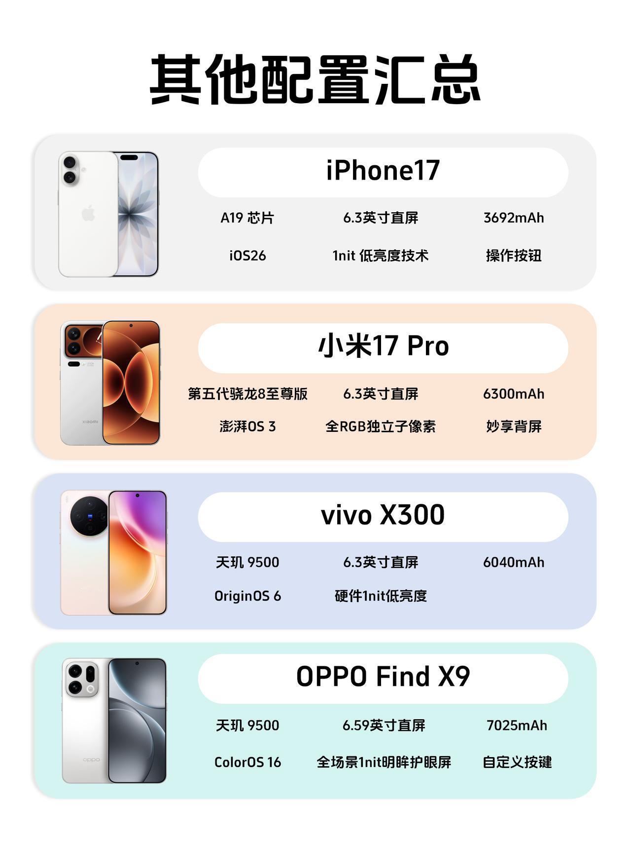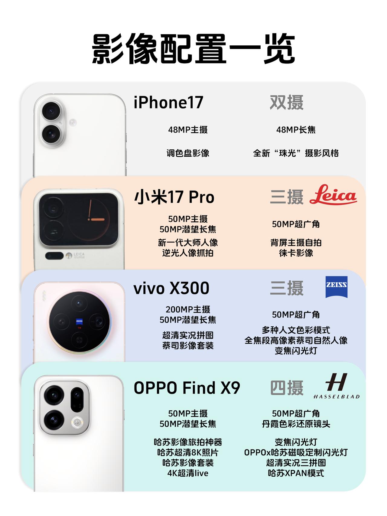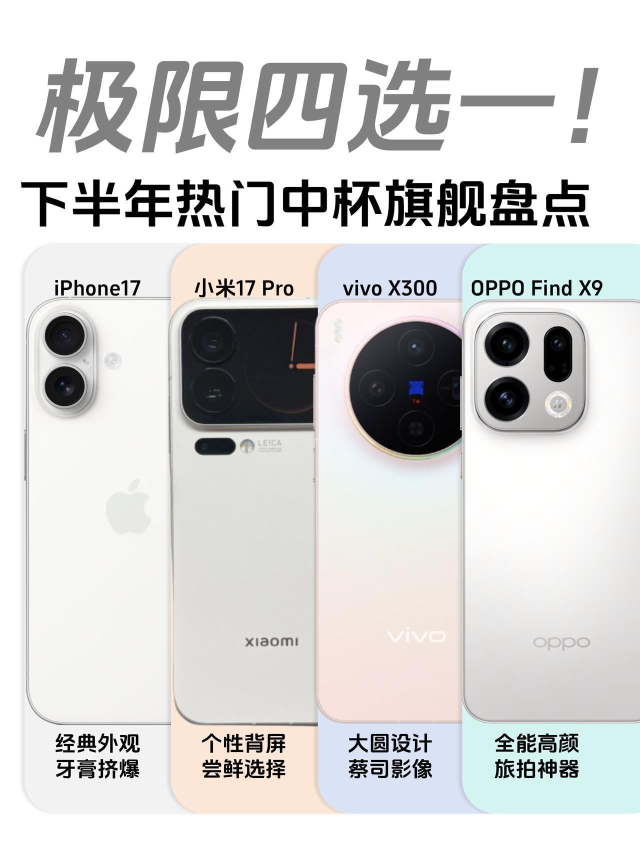 数码老司机锐评中杯旗舰新品,极限四选一! 作为资深数码爱好者,又来锐评了! 最近不少人问下半年这波中杯旗舰新品咋选,这里一篇给你讲明白了 最先登场的iPhone 17属于预算到位直接入没毛病的,补足的高刷屏之后,苹果的标准版很能打。vivo X300蔡司+潜望长焦实力不错,就是电池才6000档有点点可惜。 小米17 Pro骁龙芯片性能表现出众,喜欢打游戏可以选这款,背屏还能提供不少情绪价值。OPPO Find X9影像实力很强,哈苏四摄,有潜望长焦和丹霞,支持4K Live拍实况很不错,还支持影像套装,感觉都能跟同期大杯旗舰比一比没压力~ 我个人的话更喜欢OPPO一些,主要是拍照强,电池还是更大的7025mAh,旅游出行拍一天不怕没电,感觉会是一台不错的旅拍神器,日常使用体验也更全面,大家觉得哪款更值得入手呢? OPPOFindX9 手机摄影 新手机 iPhone17 vivoX300 小米17Pro 手机推荐