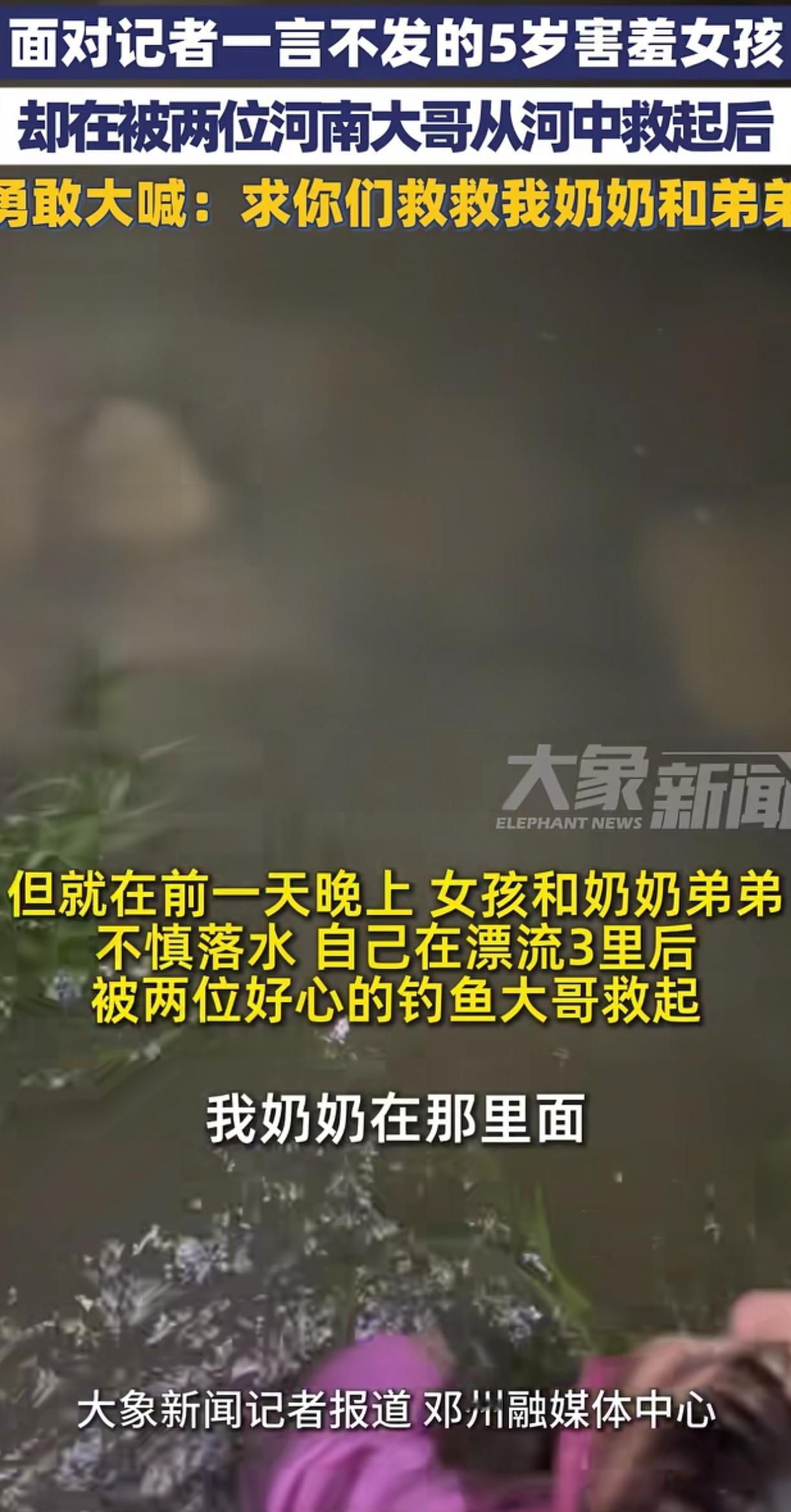 这个小女孩是她奶奶修几世得来的福报啊 自己被落水漂流了3公里被人救起后 她哭着求人去救她奶奶和弟弟 她才5岁,五岁哎,真是太让人心疼,自己都还处在恐惧中也不忘记让救救自己的家人,心里一直念着落水的弟弟和奶奶,这姑娘是真好,亲情果然是一股强大的力量,以后奶奶爷爷一定要加倍对这姑娘好 看完报道我都感动的不行,又特意去看了原视频,那两个钓鱼的哥们老早就听到哭声了,以为是闹鬼,幸好没跑,要是跑的话,小姑娘可就凶多吉少了,说她命大,命硬真是一点不为过,我相信孩子大难不死必有后福! 据说这一家四口是在10月13日晚上,小女孩和爷爷奶奶还有弟弟在过桥时不慎落水,当时爷爷奶奶和弟弟好不容易爬上岸自救了,只有她被河水裹着冲远了,爷爷奶奶沿着找人都快疯了,善良的钓鱼佬也是胆大,大半夜钓鱼听到孩子哭,还在水里整出动静,也没有撒腿就跑,要是胆小的早跑路了,这一切都是缘分,一切都无从说起 全国的钓鱼佬虽然经常空军,但是一出手就是拯救一个家庭…,之前看到过好几起这样暖心的故事,你们都是好样的 最后想再次感谢刘力,王佩两位大哥大好人,你们是真正的男子汉,小女孩碰到你们真是她的运气,你们的善良也会有福报的! 那就钓鱼“再也不空军”送给你