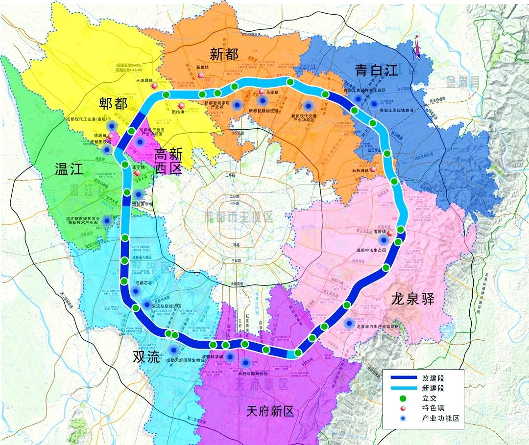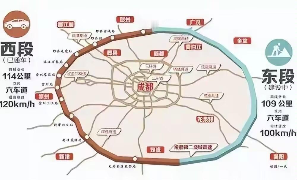 成都五环路 成都五环路是位于绕城高速与第二绕城高速之间的城市快速路,全长约142公里,总投资约349亿元,串联天府新区、双流、温江、郫都、新都、青白江、龙泉驿等8个行政区。 五环路比照甚至超越现有成都三环路的标准,修建双向八车道,中间设绿化隔离带,两旁还设立辅道和专门的非机动车道,单侧辅道的车道数会有2-3条。 天府新区段全线贯通,青白江段一期完成70%,预计2025年底通车。 温江段凤凰立交及公平段已开工,计划2027年完工;双流段成新蒲下穿隧道基本完工。 郫都区部分路段通车,未通段预计2027年竣工。 原计划2025年全线贯通,但因新都段等进度延迟,预计部分路段2025年底主体贯通,全线或延至2028年。五环大道 成都超级三环路 成都五环路