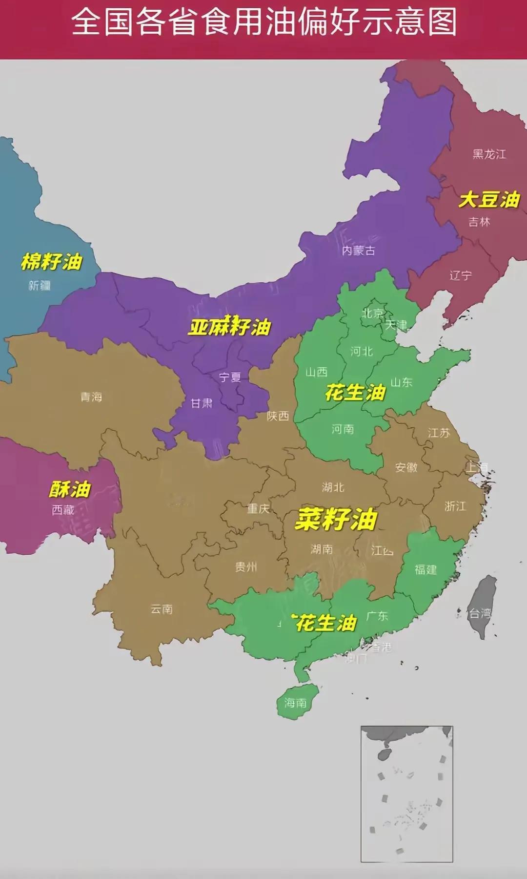 中国各片区食用油偏好地图。我国食用油主要有花生油、大豆油、菜籽油、玉米油、橄榄油、葵花籽油、茶籽油等。其中,东北人喜欢吃大豆油,华北人喜欢吃亚麻籽油,新疆人喜欢吃棉籽油,京津冀鲁和华南F4以及港澳台的人喜欢吃花生油,西藏人喜欢吃酥油,青海、西南和长江沿岸的人喜欢吃菜籽油。