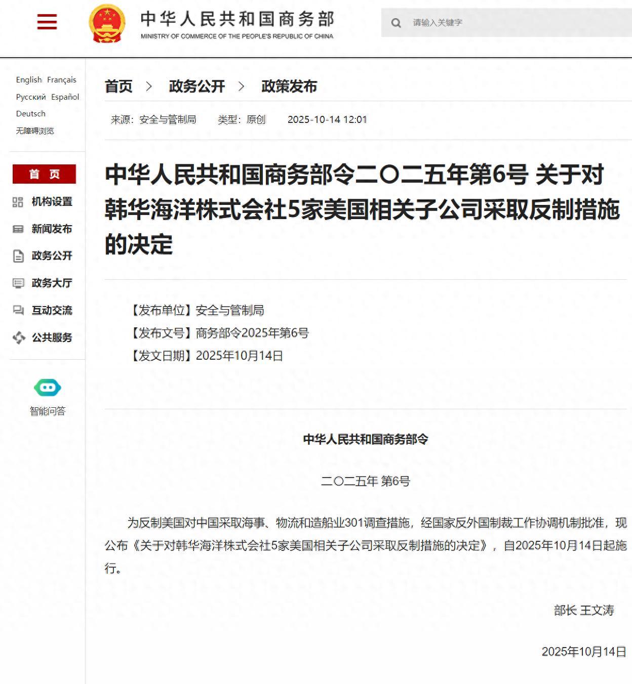 中国为何要对韩华出手? 这厮竟在今年3月强烈建议美国收中国港口费 10月14日,中国商务部将韩华海洋的五家美国子公司列入反制清单,全面禁止境内组织与其交易、合作。 这不是常规性的外交抗议,也不是象征性的关切声明,而是一次精准打击,带有清晰的警告意味。 尤其在美国新一轮对华港口费措施生效的同一天,中国的这份清单选择性极强,连韩华母公司都未波及,只一口咬住它在美国的五个业务节点,力度大,火候准,目的明确。 没有人会忘记今年3月20日那份递交至美国贸易代表办公室的“建议报告”。 韩华海洋不是被动配合,而是主动建议对中国船舶征收高额港口费用,甚至提出“鼓励美国货由美国船运输”的条款,清晰指向中国航运业。 更要命的是,这份报告被美国政府采纳,并在4月17日正式转化为301调查措施的核心依据。 这意味着,美国10月14日对中国船舶启动天价港口费政策,韩华不仅知情,还是推动者之一。 这就解释了为什么中国的反制措施选中韩华海洋,而不是其他韩国公司。 有人说韩华是美国造船计划中的新宠,刚刚追加了50亿美元投资,承接美国国家安全多任务船订单,是美国“让造船业再次伟大”计划中的关键棋子。 也正是因为如此,它的行为更具政治意味。一个与美国绑定如此紧密的企业,却又在背后推动对中国的制裁,其“双面角色”终究无法掩盖。 中国的回应非常克制,但绝不软弱。 选择制裁韩华海洋在美子公司,而未触及母公司与韩国本土企业,显示出中国并未扩大事态,而是精准打击“始作俑者”。 这一处理方式,既向外界明确信号,中国不容背后捅刀者,也给韩国政府留下回旋余地。 值得注意的是,中国这次反制与此前一系列政策动作形成联动。 就在10月10日,中国宣布对美籍船舶征收特别港务费,用人民币计价,标准对标美方措施。而在10月9日,中国又对钬、铒、铥等重稀土出口实施管制。 从海运、物流到稀土,中国正逐步构建一个多点联动的博弈体系。 韩华的“倒戈行为”,恰好为中国提供了一个强硬反制的突破口。 从战略角度看,这是一场围绕全球造船与海运秩序重构的深水博弈。 美国显然想借港口费限制中国船队进入北美市场,一边提高中国企业运营成本,另一边扶持本土造船与航运产业。 相比之下,中国的还击更具对等性和系统性。不仅以同样的港务费标准反制,还通过打击韩华这种“跨国代理人”,直接影响美国造船计划的实施节奏。 韩华海洋的尴尬境地,也给韩国敲响了警钟。背靠美国市场,依赖中国供应链,是很多韩国企业的现实处境。 但在中美竞争日趋激烈的当下,“选边站队”不再是一种战略模糊的选择,而变成了实打实的成本计算题。 韩华的选择,已经让韩国市场见识到了什么叫“误判形势”。 制裁公布当日,其母公司股价应声下跌超5%,韩国总统府更是连夜表态“正与中方沟通”,试图降低负面影响。 中国这一击,不只是惩罚韩华,更是提醒整个区域产业链:玩火者,必自焚。在过去的几年里,中国对外制裁并不频繁,也极少针对韩国企业。 但此番出手,态度前所未有的坚定,明确传递出一个信号,“谁递刀子,谁就得付出代价”。 美国试图用港口费政策重塑全球航运规则,但这场“游戏”的代价,不会由中国单方面承担。 韩华海洋想借美国东风上位,却没想到自己变成了第一块“垫脚石”。 它或许曾以为,站在美国一边就能规避风险,但如今发现,这种“投名状”在大国博弈面前,根本没有豁免权。 当港口费成了经济战场的新武器,参与者的立场就不再是模糊地带。韩华的行为,不只是商业决策,更是政治选边的结果。 而中国的反击,也不只是对企业的惩罚,更是对外部压力的系统回应。