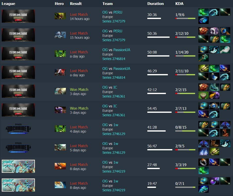 由于OG原五号位Lelis离队,队伍不得不让教练Notail上场参加最近的一些赛事,这位久疏战阵的前TI冠军表现的相当挣扎,他在大部分场次中完全找不到比赛的感觉KDA难看的离谱,尽管如此只要OG一天找不到适合的五号位Notail以及他的四个队友就得持续把这个牢坐下去,刀塔这游戏哪怕你以前再牛B,只要稍微有一段时间不打再回去玩就感觉哪都不对了,相信每个有客户端的玩家应该都深有体会[允悲]