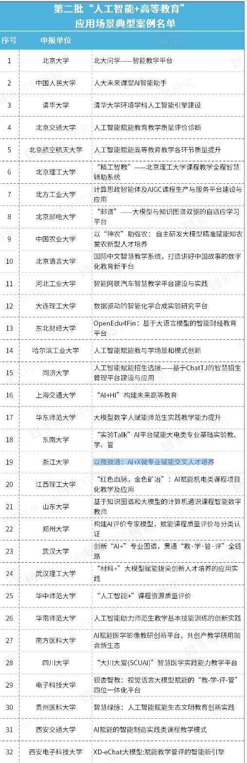 教育部公布三批80个典型案例,其中仅有10所高校连续三批均有案例入选,体现出AI+应用的实力。 近日,教育部公布了第三批“人工智能+高等教育”应用场景典型案例名单,至此,已有三批80个典型案例入选。这些案例将会在国家高等教育智慧教育平台面向全国宣传推广,成为人工智能与高等教育深度融合的示范。 三批80个典型案例中,10所高校成绩突出,连续三批均有案例入选,成为AI+高等教育应用的急先锋,也体现出这些高在“AI+”运用上的实力。这10所高校包括8所“985工程”大学和2所“211工程”大学,分别是北京大学、北京航空航天大学、北京理工大学、北京邮电大学、东南大学、哈尔滨工业大学、浙江大学、西安交通大学和西安电子科技大学、华中师范大学。