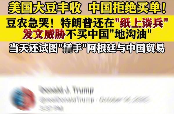 特朗普周二在社交媒体发文称:"我认为中国故意不购买我们的大豆、给我国豆农制造困难,是一种经济敌对行为。我们正考虑终止与中国在食用油及其他贸易领域的业务往来作为反制。" 大豆买卖这事,说白了就是一门生意。美国是全世界最大的大豆出口国,咱中国又是全球最大的大豆买家。 以前美国农民靠着中国订单,日子过得红红火火。但自从中美贸易摩擦加剧,咱中国逐步转向巴西、阿根廷等国家买大豆,美国豆农这才尝到了“市场失灵”的苦果。 特朗普嘴上说“中国故意不买”,可其实每个国家买啥、怎么买,都是看自己利益。咱中国大豆进口渠道多了,自然不可能再像以前那样,把订单全砸给美国。 人家巴西大豆便宜、品质也能过关,谁还非得看美国脸色?这完全就是市场规律在起作用。特朗普把大豆贸易和“经济敌对”直接挂钩,说实话有点夸张。 正常生意谈不拢就不做,这年头大家都明白。你美国企业能随时找新客户,咱中国当然也能找新供货商。再说大豆这种农产品,世界供应那么充足,根本不存在“买不到”的问题。 特朗普这么说,除了给自家豆农喊话,更大程度上还是在打“政治牌”。美国国内不少豆农选票都在中部农业州,这些地方是特朗普的“票仓”。 一旦中国减少进口,农民日子难过,特朗普就要想办法甩锅给别人。说中国“敌对”,既能煽动情绪,又能掩盖自己在农业政策上的短板。 特朗普话音刚落,不少美国农民心里估计都在打鼓。咱中国市场说不要就不要了?美国豆农还能靠谁养活? 就拿最近这几年来说,中国一旦减少采购,美国大豆价格立马“跳水”。美国官方数据白纸黑字写的明明白白,中国订单一缩水,美国粮仓立马堆积如山,农民只能硬撑着等补贴。 而且,咱中国的食用油、豆制品消费市场,是全世界最大的。美国真要“断了这条线”,别说农民,连粮食贸易公司、港口、运输业都得跟着受影响。 特朗普一句话很容易,底下的连锁反应却得让无数美国老百姓买单。从咱中国角度讲,大豆早不是美国的“独门生意”。 这些年中国进口大豆渠道越铺越宽,巴西、阿根廷、俄罗斯都成了主力供货商。尤其是巴西,靠着中国这块大买家,种植面积、产量连年创新高,甚至有时候还会出现“供大于求”的局面。 更何况,咱中国这些年一直在推动大豆产业多元化。东北大豆基地产量逐年提升,豆制品工厂也在技术升级。 真到了关键时刻,咱中国完全有能力顶住“断供”压力。美国要真把生意一刀切断,丢的其实是自己饭碗。 特朗普现在又把“终止食用油及其他贸易”挂在嘴边,说白了还是在“吓唬人”。真要一刀切,美国企业、农民、甚至消费者都得挨刀。 中国市场不是谁都能替代的,尤其是美国农产品,如果丢了中国,短期内根本找不到这么大的买家。 特朗普这次又把“经济敌对”搬上台面,说到底还是为了国内选票和政治表演。大豆贸易说白了就是生意,谁都想多挣钱、少麻烦。 你要真一意孤行,最后吃亏的还是美国农民。咱中国市场大、选择多,谁都不能指望用大豆“绑架”中国。 世界变了,贸易不再是一家独大。特朗普要想“赢麻”,靠喊话是没用的。咱中国的底气,是多年积累下来的实力和全球布局。 市场是讲规则、讲竞争的,谁真把自己当“老大”,最后只能被市场淘汰。美国大豆、食用油要想卖得出去,还得看中国市场认不认。 特朗普的“炮轰”,这回恐怕只能自嗨一阵,现实会很快教他做人。 参考资料: 《特朗普指责中方故意停止进口美国大豆,外交部回应》——环球网