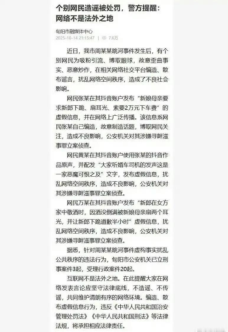 3人造谣新郎跳河被立案侦查。造谣被查活该!当然,如果通报能够对新郎跳河的具体原因披露得更详细点,谣言可能就会没有滋生的空间了!