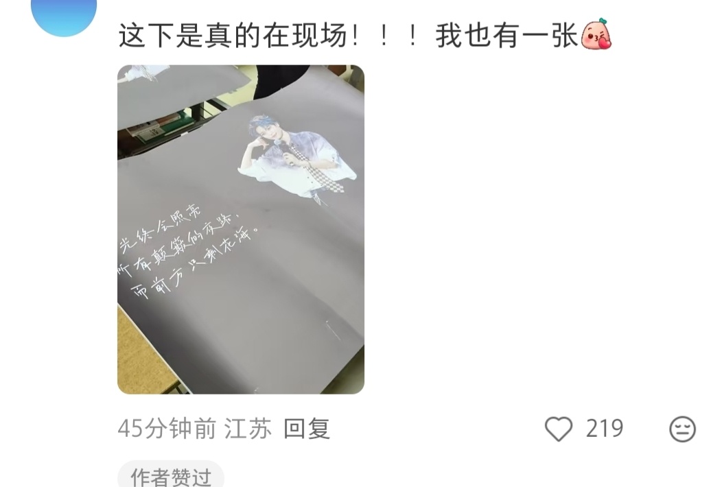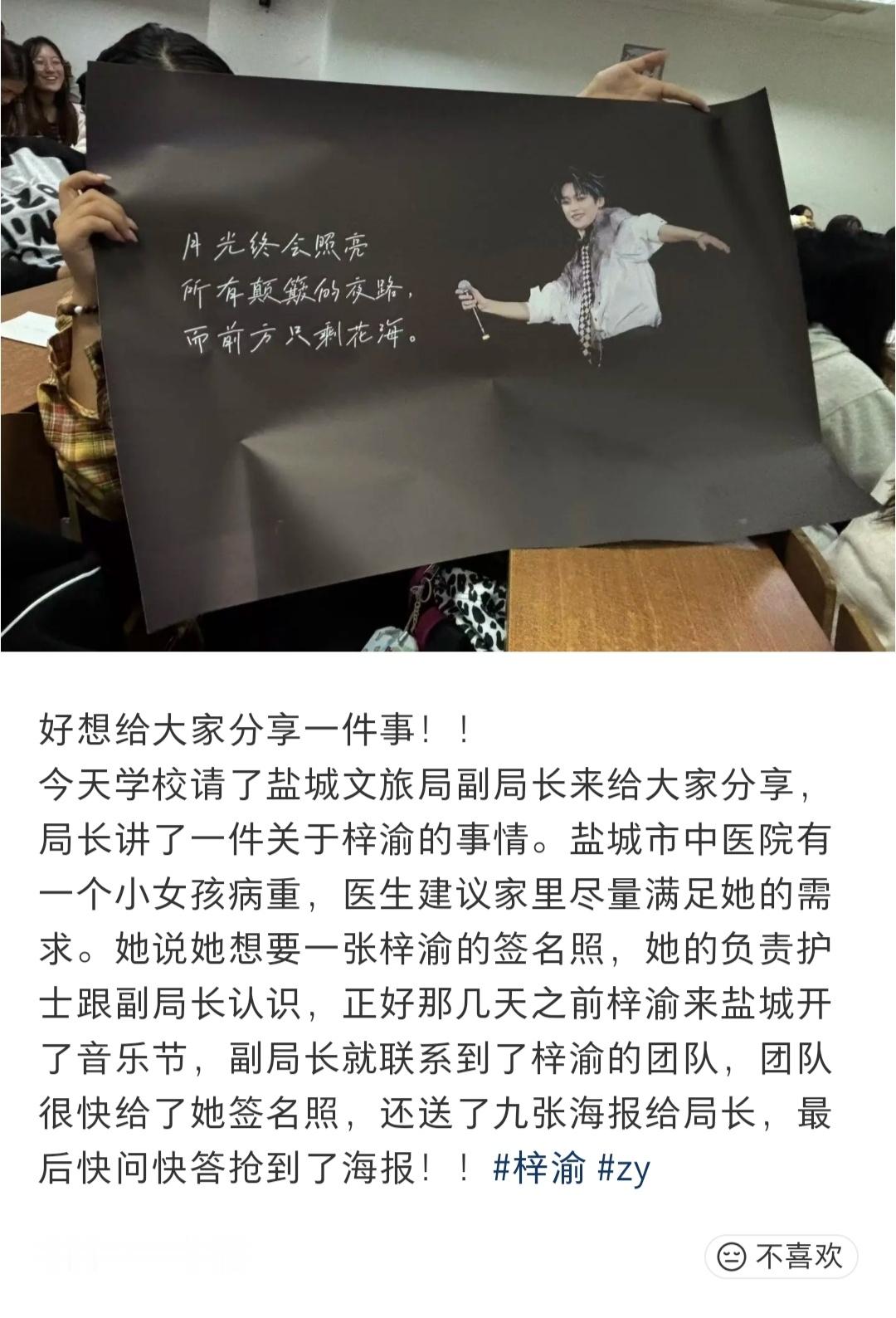“盐城市中医院有一个小女孩病重,医生建议家里尽量满足她的需求。她说她想要一张梓渝的签名照,她的负责护士跟副局长认识,正好那几天之前梓渝来盐城开了音乐节,副局长就联系到了梓渝的团队,团队很快给了她签名照,还送了九张海报给局长” 盐城文旅局局长谈梓渝带来的效应