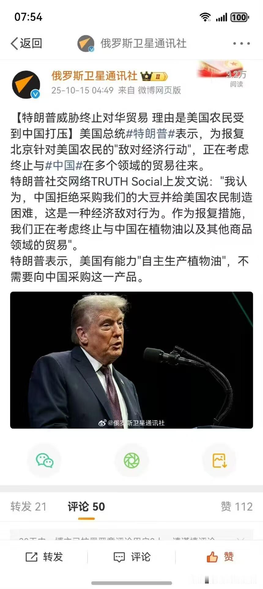 对美国政府来说这是一则可怕的消息! 中国自己种植大豆,而不是从美国购买,专门是为了给美国农民制造困难的。也算是报当年美国奸计搞垮我们自己大豆种植产业的一箭之仇。 特朗普说:“这看起来更像是一种经济敌对行为。美国可以对中国进行报复,停止购买植物油并开始自行生产。” 税王逻辑一如既往:他们怎么敢自己种植大豆,而不关心美国农民? 问题是,曾几何时,中国的大豆种植和出口曾经在世界上是第一梯队的。这才过了20多年,美国就忘了吗? 在对稀土实施限制以及对一系列美国公司实施制裁后,美国人的恐慌情绪并未平息。而事实上,中国目前只是对美国做出了有限的回应,却在美国市场引发了一波恐慌。 但美国人甚至不能自己榨油,这是我没想到的,哈哈哈…… 此外,税王再次威胁要对金砖国家实施制裁,对来自金砖国家的商品征收100%的关税,因为这些国家在进行去美元化。具有讽刺意味的是,懂王越是疯狂和威胁,去美元化进程就越是加速,这是必然。 #特朗普抱怨称中国故意不买美国大豆# #热点观点#