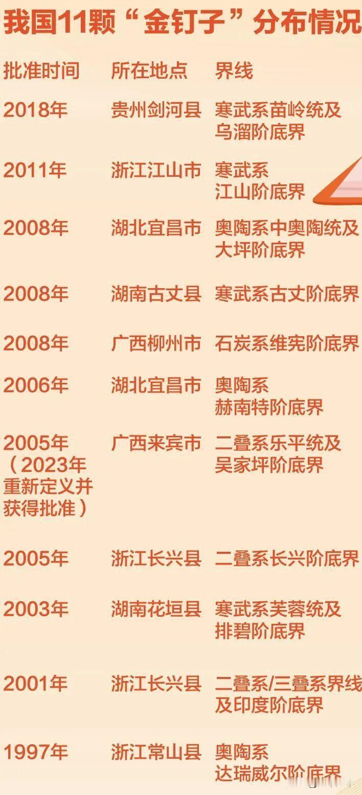 贵州省黔东南苗族侗族自治州剑河县革东镇八郎村的“金钉子”,是全球第六十九颗、我国第十一颗“金钉子”。 贵州剑河县的“金钉子”是全球寒武系苗岭统乌溜阶全球标准层型剖面和点位,是国际地质学界公认的地质年代划分“标尺”,代表距今约5.06亿年的寒武纪中期地层标准。24年3月,贵州法院发布《古生物化石暨“金钉子”司法保护令》,设立司法保护基地,明确禁止非法挖掘、买卖、破坏性开发等六项禁令。剖面长期开放供全球科学家研究,强调“保护非封闭,而为深化科研服务”。八郎村建成古生物化石陈列馆,它联动剑河温泉(“苗疆圣水”)、红色文化(红军宿营地)、苗族非遗(锡绣、水鼓舞)等资源,打造“金钉子+金温泉”特色旅游线路。 金钉子不是黄金打造,而是铁、铜、有机玻璃等材质。金钉子得名于横贯北美大陆的铁路贯通时,用18K金打造的一颗铁路道钉。是用于地质年代界线划分确定用的。