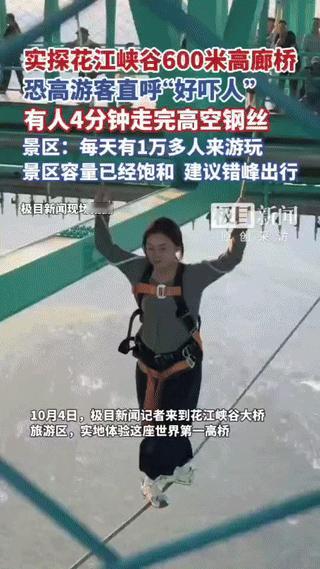 10月7日,一名游客在体验花江峡谷大桥高空走钢丝项目时意外掉落,现场工作人员迅速启动应急机制,通过安全绳装置将其救回平台。 其实该走钢丝项目位于花江大桥桥面以下600米的峡谷高空,参加活动的游客需佩戴全身式安全绳,连接上方滑索轨道。即使发生失足,安全绳会立即悬停人体,并由工作人员通过牵引系统快速拉回平台。虽然游客在挑战前需签署安全协议,并有现场教学环节。但游客还是要自己注意需充分评估自己的身心条件。 花江峡谷大桥被誉为世界“双一流”大桥,高度最高(桥面距水面625米)主跨最长(1420米创山区桥梁跨径纪录)。其开展的桥旅融合的项目也是世界首屈一指的,包含了高空走钢丝、高空荡秋千、高空蹦极(落差625米)、高空玻璃观景台餐厅、207米高空观景电梯等游览项目。在这次国庆节期间每日预约人数超一万人,也暴露出来了客流高峰导致服务区承载紧张(摆渡车需排队40分钟)等问题。希望以后能更好的招待远方的朋友们。
