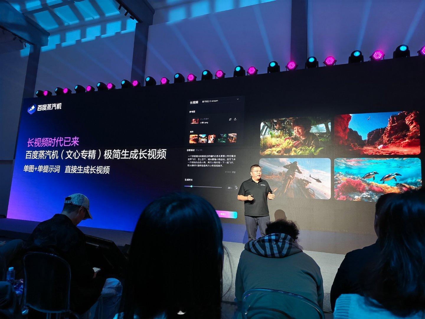 百度蒸汽机可以极简生成长视频,通过单图加单提示词就可以生成长视频,创作者可自由掌控视频内容的走向,可以任意时刻打断,任意位置编辑,非常方便,每个人都可以做导演。