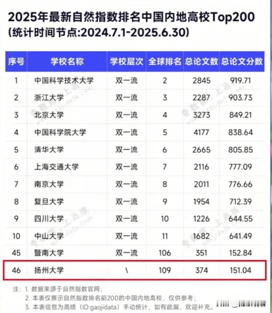 扬州大学太牛!自然指数全球109位🔥 我的天!扬州大学这波真的要吹爆!最新自然指数排名出炉,直接冲到全球高校第109位,中国内地高校第45位,这实力也太顶了吧!👏 可能还有朋友不清楚,自然指数可不是随便排的!它是靠《自然》《科学》这些顶刊的论文成果说话,妥妥的科研实力“硬指标”。能在全球高校里站稳这个位置,扬大的科研含金量真的没话说! 其实扬大一直是低调的实力派!13大学科门类全覆盖,农业科学、化学等3个学科更是冲进ESI全球前1‰,14个学科稳居ESI前1%。2024年拿了198项国家自然科学基金,经费飙到5.5亿+,还有丁建宁教授团队成果登过《Nature》,这硬实力藏都藏不住! 更绝的是它超稳,连续6年省属高校考核第一等次,现在又刷新排名,这发展势头谁看了不夸一句牛! 我以前总觉得扬大接地气,没想到科研这么能打,深藏不露的宝藏大学实锤了!为扬大疯狂打call✨