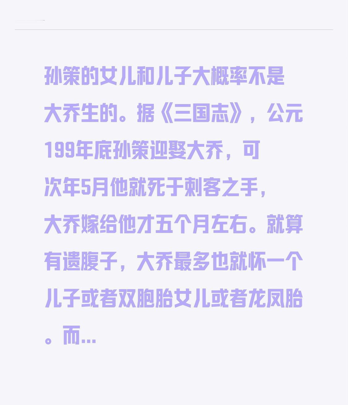 孙策的女儿和儿子大概率不是大乔生的。据《三国志》,公元199年底孙策迎娶大乔,可次年5月他就死于刺客之手,大乔嫁给他才五个月左右。就算有遗腹子,大乔最多也就怀一个儿子或者双胞胎女儿或者龙凤胎。 而历史记载中,孙策有一个儿子孙绍和至少三个女儿。孙绍一开始被封为吴侯,后改成上虞侯;他的三个女儿分别嫁给了顾邵、朱纪和陆逊。所以基本能判断,孙策除了大乔,肯定还有别的老婆。