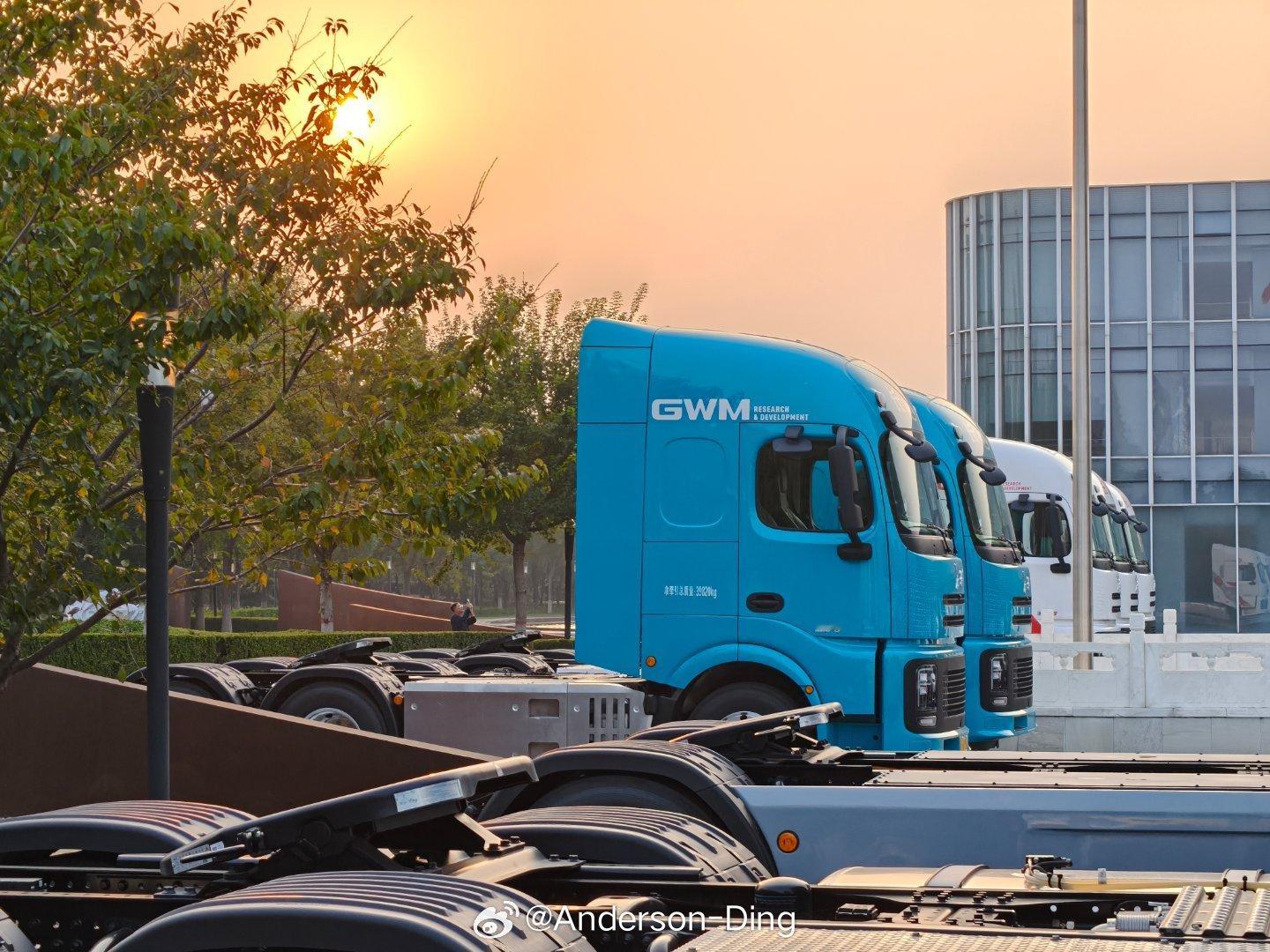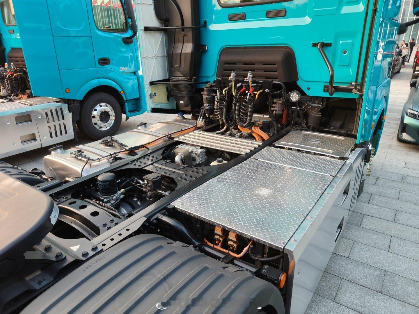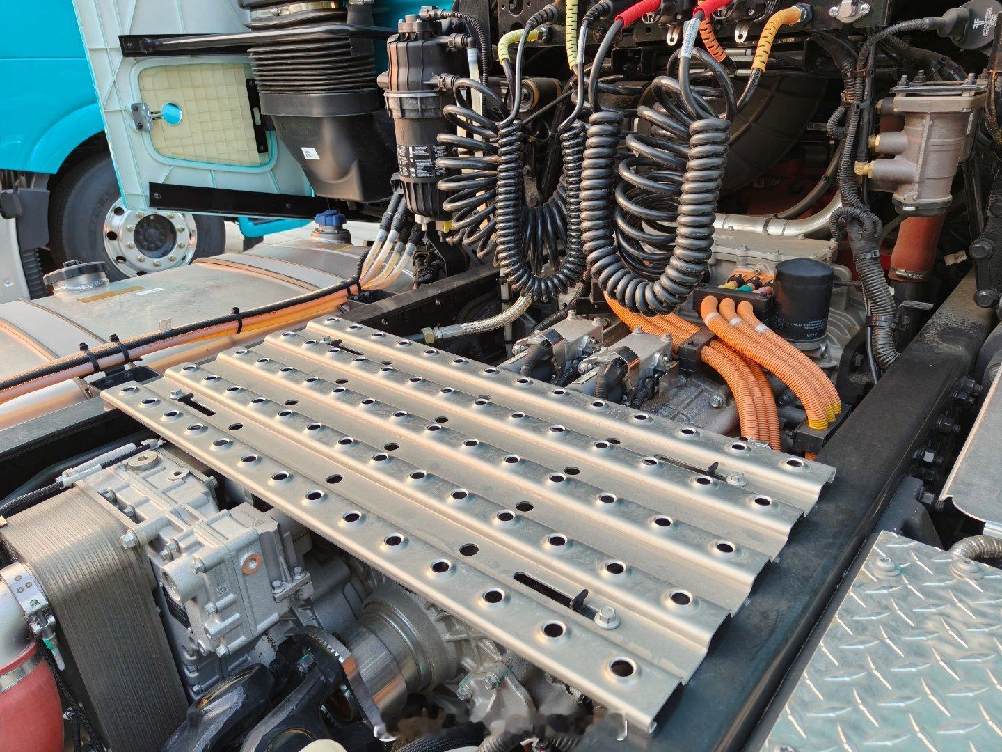 发动机是13升康明斯560马力2600牛·米,搭配8挡DHT还有总功率60千瓦的前后双电机。12.9度的三元锂电池组放在大梁的副驾驶侧。