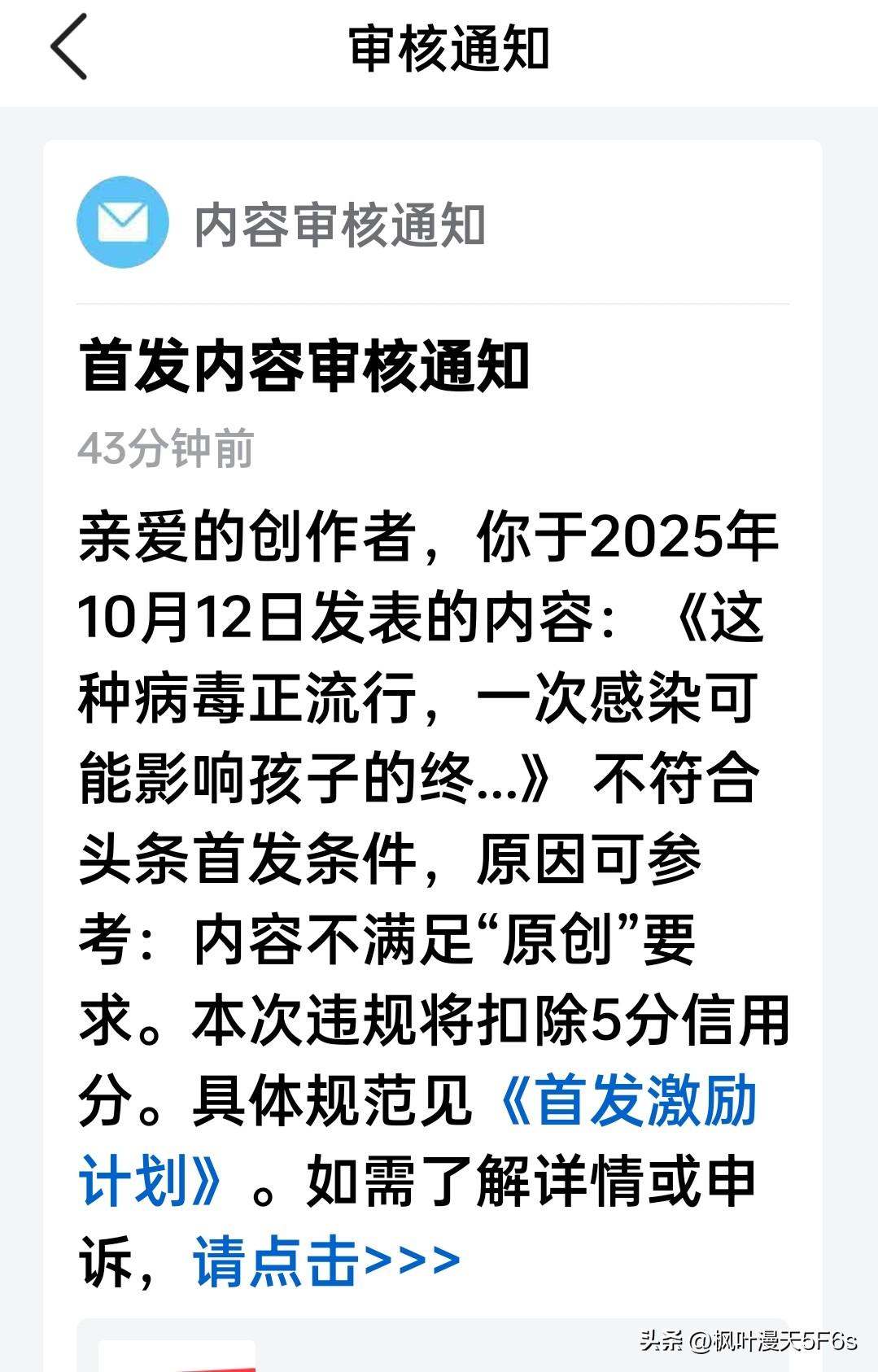被头条取消头条首发,又扣了5分信用分,心里堵得慌,想说点什么。 就刚才,收到平台通知,我那篇关于呼吸道合胞病毒的文章,被取消了“头条首发”,还扣了5分信用分。看到消息那一刻,脑子里“嗡”的一声,整个人都蒙了。 我坐在电脑前,对着屏幕发了好一会儿呆。脑子里反反复复就那几个问题:我到底哪里做错了?是踩了什么我没注意到的坑吗?还是……被误判了? 为了写那篇文章,我查了多少资料啊。我看到上海市儿童医院说急诊量涨了30%,看到北京儿童医院的谢正德主任提醒“回家别急着亲孩子”,还看到说这次病毒流行期提前了,一次严重感染可能影响孩子长期的呼吸健康。我就想,这么多家长不知道,我得赶紧写出来,提醒大家啊。 我把这些重要的信息,掰开了、揉碎了,用大家能听懂的话讲出来。我没想别的,就想着多一个人看到,可能就少一个孩子受罪。 可现在,一切努力好像都白费了。不只是白费,还背了个“有问题”的名声。这信用分一扣,心里就跟压了块石头似的,沉甸甸的,喘不过气。 委屈,不甘心,还有种说不出的窝火。 我又没胡编乱造,说的都是正经八百的专家提醒和官网消息,怎么就落得这么个结果?我看着那些博眼球的标题党文章活得好好的,我这实心实意想帮点忙的,反而被打下来了?这到底公不公平? 我也申诉了,可这心里一点底都没有。盼着能通过,又怕等来的还是坏消息,这种悬在半空、不上不下的感觉,真的太折磨人了。 可能很多认真写过东西的朋友都经历过这种时刻吧。一腔热情被冷水浇灭,满心期待换来一盆冰水。那种自我怀疑,特别伤人心。 算了,说这么多也没用。日子还得过,稿子……或许也还得写。但心里这个疙瘩,还有那被扣掉的5分,就像一根刺,扎在那儿,一动就疼。 我就是心里憋得慌,想找个地方说说。这其中的悲苦彷徨,没经历过的人,可能真的很难懂。 希望审核人员能认真负责审核。希望自己的申诉能有一个好结果。 爆料 分享今日的感悟