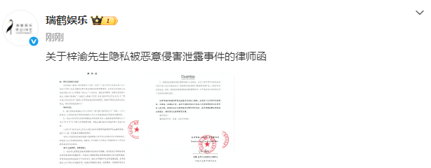 关于梓渝先生隐私被恶意侵害泄露事件的律师函瑞鹤娱乐发了律师函