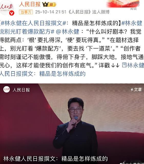林永健虽然颜值不高,不算大红大紫,但长得有辨识度,演技好,作品多,所以很多观众也算熟悉。所以出道几十年,林永健凭借作品和实力,成为一级演员、中国视协副主席、电视界职业道德建设委员会副主任。难怪最近要在人民日报发表文章《精品是怎样炼成的》。文中提到,现在经常会遇到一种情况:某些顶流演员,排场很大,自带“编剧团队”进组,随时准备给剧本“动手术”。林永健人日发文批某顶流演员排场大