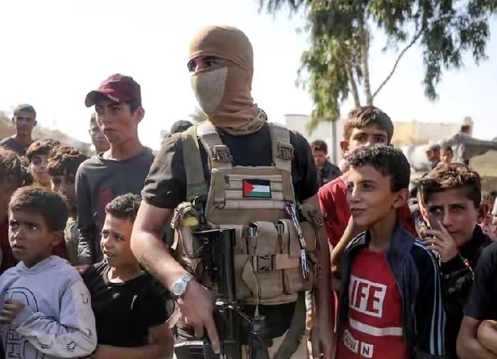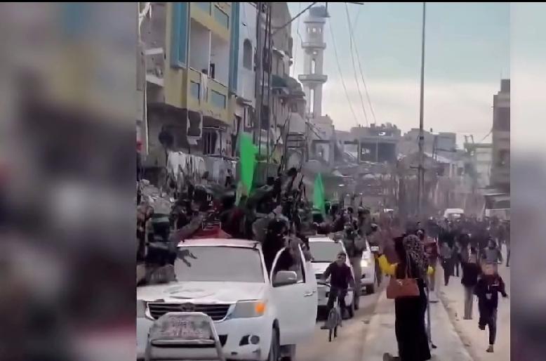 加沙街头出现巴勒斯坦人民欢迎哈马斯的镜头,哈马斯武装坐在卡车上,一辆辆卡车驶过,