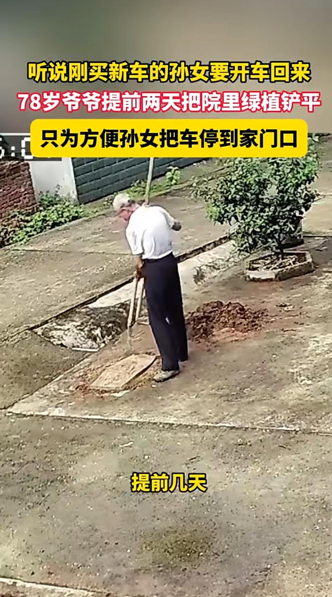 九江78岁爷爷铲平院绿植,就为孙女停车!网友:这爱比新车还暖 10月13日,江西九江一位78岁爷爷拿着小铲子,蹲在院子里忙活两天,把养了好几年的绿植全铲平了,光秃秃的院子留出块整整齐齐的空地。邻居凑过来问才知道,老爷子是听说刚买新车的孙女要开车回家,特意腾地方让孙女把车停到家门口。 这事儿传到网上,评论区直接暖成“亲情聊天室”。有网友说自家爷爷也这样,自己随口提句爱吃腌菜,爷爷立马在阳台砌了个小坛子;还有人晒出爷爷提前擦好的家门口台阶,说每次回家都跟“迎接贵宾”似的。大家都笑,老一辈的爱从来不是“我爱你”挂嘴边,而是像“提前预热的暖气”,悄咪咪就把你需要的都备好。 不过也有网友打趣,“爷爷是不是忘了问孙女车多大?万一铲的地方不够停可咋整”,还有人说“绿植铲了有点可惜,其实可以整个简易停车桩”,但吐槽归吐槽,没人不夸老爷子的心意实在。 这一切的起因,不过是孙女那句“要开车回家”的消息。在爷爷眼里,孙女的方便比啥都重要——养了多年的绿植再宝贝,也抵不上孙女停车时不用绕路、不用找位的踏实。那些被铲掉的花草,哪里是植物,分明是爷爷攒着的、想给孙女的“方便和安心”。浇菜园的老奶奶 爷爷门前的风景 奶奶种菜 带老人秋游 作者声明:素材来源网络