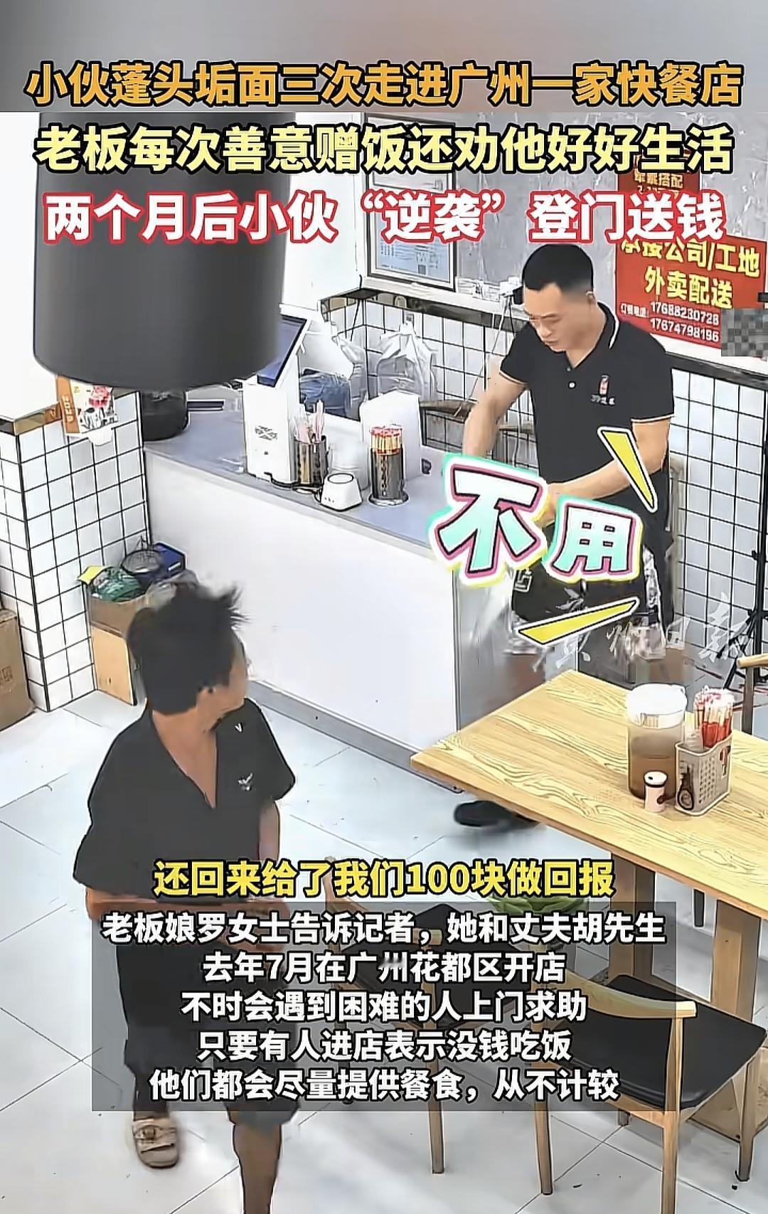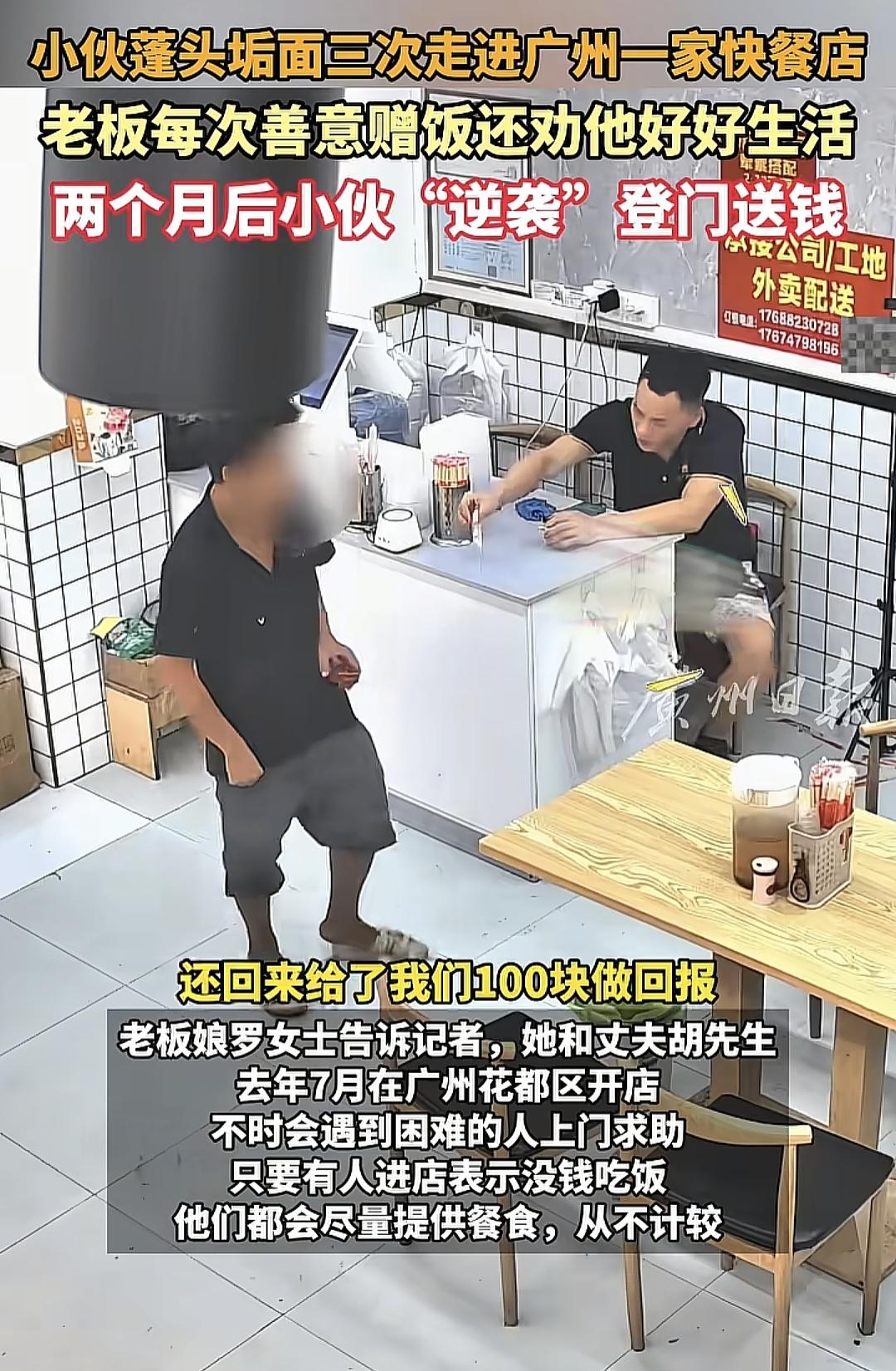 好感动这种双向奔赴的温暖! 广东小伙蓬头垢面三次走进同一家快餐店吃了免费饭,老板善意给他免单,还劝说他“你这样邋里邋遢的活着有什么意思,找个事情做,不要自杀,也不要做违法的事情”,没想到这一切小伙都听进去了,两个月后,一个收拾的利索的小伙来店里,从口袋里掏出了100元递给老板胡先生做“回报”,转身便就要离开,老板拉住他说“不用,不用”,我们一直都是这样的给暂时遇到难事的朋友们免费提供饭食,不用记在心上的,两人一直相互客气的推让着。 据老板娘回忆,这位先生第一次来店里吃饭是7月份,当时他身无分文,老板二话没说给他打了一份饭菜,第二次,他再过来的时候,老板娘就多嘴问了一句他是不是遇到了难处,想帮忙联系亲人,第三次就劝说他去找工作,不要再这样活着,没想到就两个月的时间,他简直“脱胎换骨”,再次来店里我一下子都没认出,不过还是很高兴能帮助到他 网友: 知恩图报的人不会差,老板的善良也值得了,这样的老板想不发财都难 大伙纷纷想去她店里打卡,称赞她“刻在骨子里的善良”,每每看到这种新闻都感动的不行,这个世界总有人在帮忙缝缝补补,简单的一句“不要自杀也不要违法”,比那些鸡汤实际的多,这次老板娘善意的帮助和鼓励,胜却万语千言! 至于这100块,老板,老板娘你们还是收下呀,这是他的一片心意,也是他努力拯救自己的生活赚到的钱,收下他会更有前进的动力,自信和勇气,你们觉得对吗?