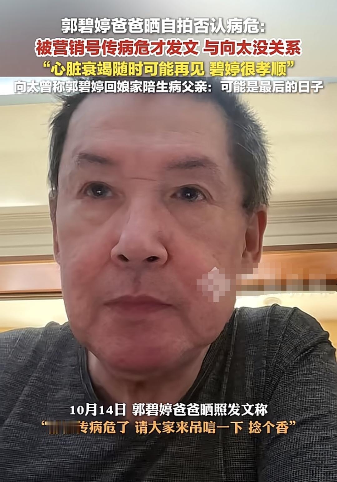 向太这次说的话郭碧婷可不爱听了 “她珍惜她爸爸,可能是最后的日子” 结果郭碧婷爸爸发自拍打脸向太 力破病危传闻 向太现在是怎么回事,一个爆一个自己料,这是什么新的引流招数? 人家都说家丑不可外扬,向太倒好感觉家底都快要爆完了,向家现在是不是真的有问题了啊? 心脏衰竭这种器官衰竭虽然说确实危险,但平时注意一直吃药是可以得到控制的,没到那个时候真不能乱说,有的人一直吃药控制都还是过好多年,更何况他们还是条件这么好的。 人郭碧婷爸爸只是生病而已,想夸儿媳妇孝顺照顾父亲就好好说塞,向太这样说“最后的日子”,确实容易让人误解,放大,也不能全怪人家营销号