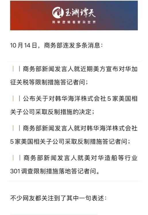 中方一天内4次重磅声明,一句话让美方彻底破防:这次真的有大麻烦了西方媒体普遍注意到,我方在一天之内连续4次发表重磅声明,全都是围绕对美方反制的,其中既有反制韩华等5家美国海事子公司的决定,也有对美方宣布再次对华加征关税的正式回应。 中美经贸关系自2018年以来反复拉锯,进入2025年,摩擦再度升温。美国贸易代表办公室在4月启动针对中国海事和造船领域的301调查,指责中国企业涉嫌不公平竞争,并逐步推进限制措施。到9月,美方宣布对部分中国出口产品加征关税,涉及电子元件和机械设备,总额达数百亿美元。这一系列动作旨在压缩中国在全球供应链中的份额,但实际效果适得其反。中国出口数据显示,对东盟和欧盟的贸易额分别增长15%和12%,总出口增幅超过8%,而美国制造业订单下滑1.4%。 美方意图通过“切香肠”式施压,逐步蚕食中国优势,却忽略了对手的韧性。北京方面始终坚持多边主义,通过世贸组织渠道表达不满,同时调整对等清单,避免立即全面对抗。这种克制源于对全球稳定的考量,但也为后续反制积蓄力量。贸易战本质上是实力较量,美方经济数据暴露虚弱,军工和制造业因关键矿产依赖而步履维艰。中国则凭借多元化市场布局,转危为机,出口结构优化明显。这段积累期,双方举行四轮谈判,每次焦点从知识产权转向关税互征,磋商虽未破冰,却为10月的转折埋下伏笔。 10月14日成为中美经贸摩擦的分水岭,中国商务部密集发布四份声明,全方位回击美方最新举措。第一份针对韩华海洋株式会社在美国设立的五家子公司实施反制,这些子公司涉嫌协助美方301调查,损害中国企业权益。措施包括限制业务往来和资产审查,旨在维护公平竞争环境。第二份直接回应美方宣布的对华加征关税,强调单边主义只会放大全球损失,已通过正式渠道通报立场。第三份聚焦美对造船业的新限制,指出此类措施扭曲市场规则,中国将确保航运协定平等执行。第四份涉及稀土出口管制调整,覆盖七种关键元素和相关产品,旨在保护国家资源安全。 这些声明节奏紧凑,从上午9点到傍晚5点逐一上线,覆盖海事、关税、造船和矿产领域,显示出系统性应对。商务部文件统一表述立场,突出反制必要性,同时呼吁回归对话。这种密集发布并非仓促,而是前期评估的结果,体现了中国在经贸领域的战略定力。美方近期动作密集,港口货物清关延误频发,中国企业已转向新兴市场,缓冲冲击。这一天的声明,不仅是战术调整,更是底线宣示,打破了以往被动姿态。 四份声明中,一句核心表述反复出现:打,奉陪到底;谈,大门敞开。这与以往顺序颠倒,先列对抗准备,后提合作路径,引发西方媒体广泛解读。CNN等美媒强调,此次表述变化体现中国罕见主动出击,表明已做好最坏打算。过去,中国原则阐述常将“谈”置于前列,“打”居后,以示和平意愿。但在贸易战拖延六个月、四轮谈判无果后,美方虚弱暴露,中国选择先硬后软,摆明无所畏惧。稀土管制新政尤为关键,直接影响美国制造业和军工供应链,几乎每一环都受波及。 这相当于中断美方“切香肠”步骤,当对手试图一步步施压时,中国直接调整规则,明确告知:无相互尊重,难有实质收获。商务部发言人通过记者问答重申,中美拥有广阔合作空间,合则两利,斗则俱伤。但前提是平等协商,美方言行不一,只会自食苦果。这种表述接地气,却蕴含深意,反映中国从防御到反攻的底气来源:经济数据强劲,出口不降反升,对非洲和拉美市场开拓迅猛。美媒观察家指出,这句表态让白宫受冲击,官员在采访中承认局面严峻。 美方反应迅速却显慌乱,白宫新闻秘书在镜头前紧握讲稿,承认需评估影响。国会听证会上,证人报告贸易战暴露供应链断裂,成本推高本土产业负担。韩华子公司紧急列出损失清单,美东海岸港口集装箱延误,军工部件进口受阻。特朗普政府拟增100%关税反制稀土新规,但内部评估显示,此举将进一步打击美国电子和汽车业。西方分析认为,美方从4月起本想掌握主动,却在六个月内将弱点放大:制造业指数下滑超预期,军工业延期交付合同频现。 中国立场一贯,敦促美方纠正错误,通过对话相向而行。但美方官员低声透露,这次麻烦不小,盟国协调也遇阻力。欧洲布鲁塞尔贸易官员讨论供应链影响,东京股市波动加剧电子业担忧。全球视角下,中国声明成头条,推特热搜攀升,贸易战转折迹象初现。美方困境在于依赖中国关键资源,却屡屡单边施压,忽略互利本质。这次破防,不仅是话语冲击,更是实力对比的镜像。