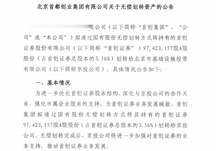 10月15日,北京首都创业集团有限公司(以下简称首创集团)拟通过国有股份无偿划转方式,将其持有的首创证券9742.316万股A股股份(占首创证券总股本的3.56%)划转给北京市基础设施投资有限公司(以下简称京投公司)。