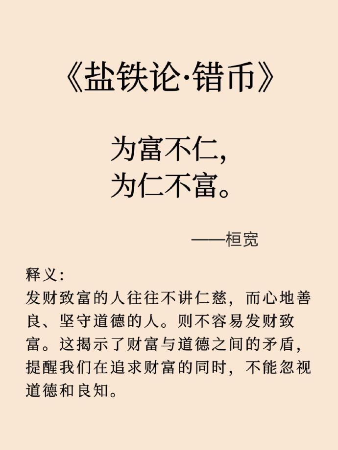 《盐铁论》这八句话背下來,少走10年弯路。这八句话,每一句都充满着大智慧,比如,为富不仁,为仁不富。意思是发财致富的人往往不讲仁慈,而心地善良、坚守道德的人。则不容易发财致富。这揭示了财富与道德之间的矛盾,提醒我们在追求财富的同时,不能忽视道德和良知。建议大家保存下来,没事多读一读这些千古金句,品一品其中的大智慧,洞见财富本质,回归底层逻辑,探索财富路径,能把这些悟透,真的可以少走10年弯路。#寻美三湘##长沙新朋友# 正版盐铁论经典名著全本全注丛书窥探汉代政治史经济史的真相书